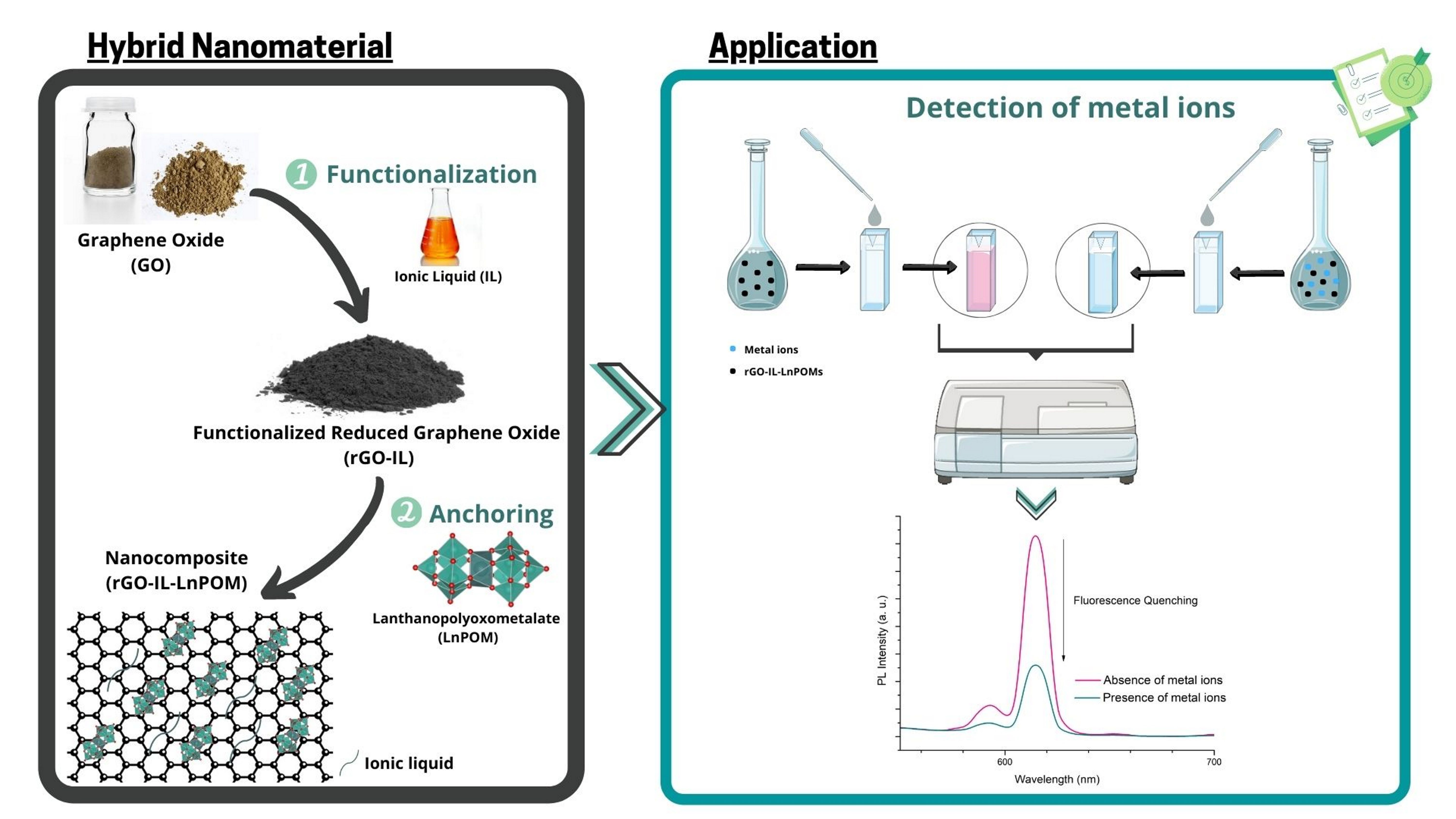 In recent years, the chemical modification of graphene materials has been largely explored in order to obtain materials with new properties. The covalent functionalization of graphene oxide (GO) with an ionic liquid (IL: 1-octyl-3-(3-triethoxysilylpropyl)-4,5-imidazolium chloride) promotes the reduction of GO and results in a hybrid material that can incorporate lanthanopolyoxometalates (LnPOM) through anion exchange processes. LnPOM are interesting functional units in materials science because the photoluminescence of the lanthanide can be explored in the development of optical devices. For example, it has been described that LnPOM containing Eu3+ ion exhibit photoluminescent properties due to the excitation paths that involve ligand-to-metal charge-transfer states associated with O-Ln and O-Mo transitions. However, the preparation of luminescent graphene materials containing this type of LnPOM remains poorly studied.This research aims to prepare new hybrid nanomaterial based on LnPOMs supported in functionalized GO and to study their luminescent behavior. The attachment of Na9[Eu(Mo5O18)2] in reduced graphene oxide (rGO) was carried out by GO functionalization with ionic-liquid cations. In a subsequent stage of the research, the photoluminescent properties of the hybrids were explored as a tool for detecting heavy metal ions in aqueous solutions. The results have shown that the presence of heavy metals induces significant changes on the photoluminescent behaviour of the hybrid nanomaterial. We took advantage on this observation in order to develop rGO-IL-LnPOM hybrid materials that have great potential as nanosensors for environmental pollutants monitoring.