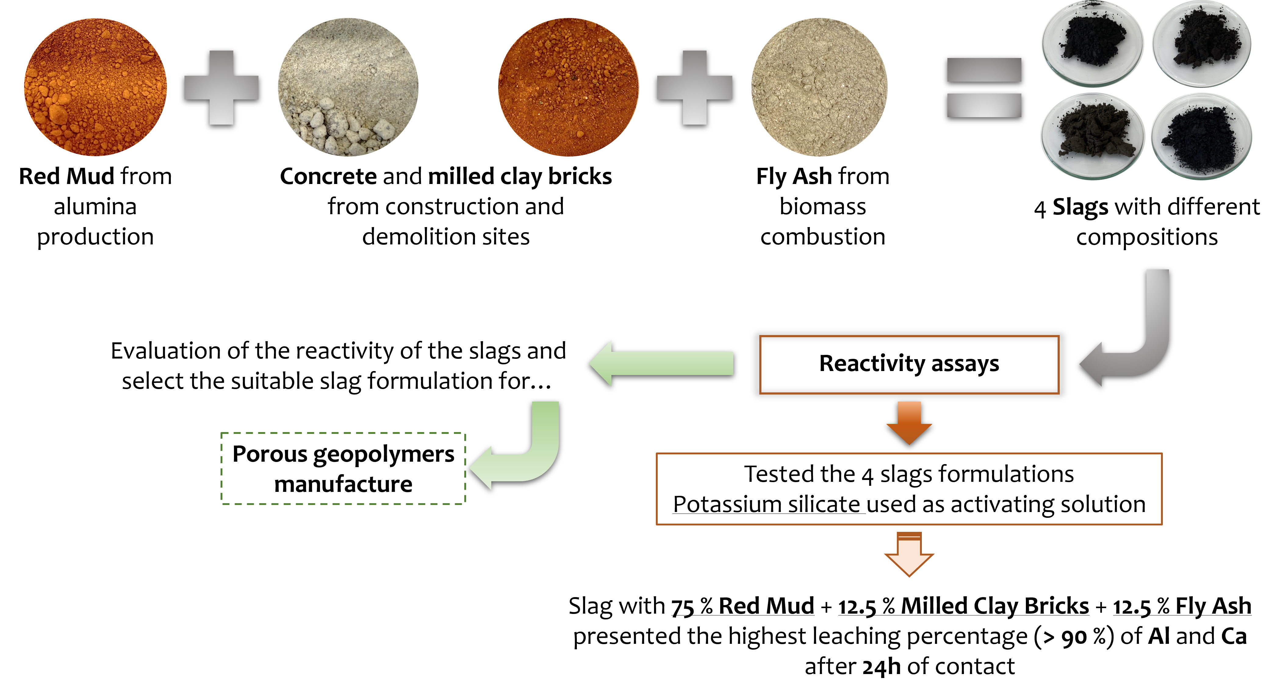 Bauxite residues from alumina production (also known as red mud), fly ash from coal combustion or construction and demolition wastes are some examples of solid wastes and residues generated worldwide in large amounts, every year. These wastes can be incorporated into new materials for the construction sector, thus creating value and avoiding resource depletion in the manufacture of new construction materials. During the geopolymerization process, the Si-based precursor reacts with an alkaline activator to form a geopolymeric past, which can be used to obtain new products such as mortars. In this work, the precursor was prepared as a slag, combining different proportions of the wastes under study, namely red mud, clay bricks from construction and demolition wastes, and fly ash. The reactivity of the slags was studied using a commercial activating solution to evaluate the leaching of aluminum, calcium, and iron in the first 24 h, at a constant temperature and stirring.Mixture 1, which has a red mud:clay bricks:fly ash ratio of 6:1:1, showed the highest leaching of Al, Ca, and Fe compared to the other compositions. In fact, approximately 70 % of Al and Ca were leached in the first 6 h, reaching values higher than 90 % after 24 h. These values suggest that the synthesized slag was a very high reactivity which will now be explored to produce geopolymeric components envisioned for the construction sector.