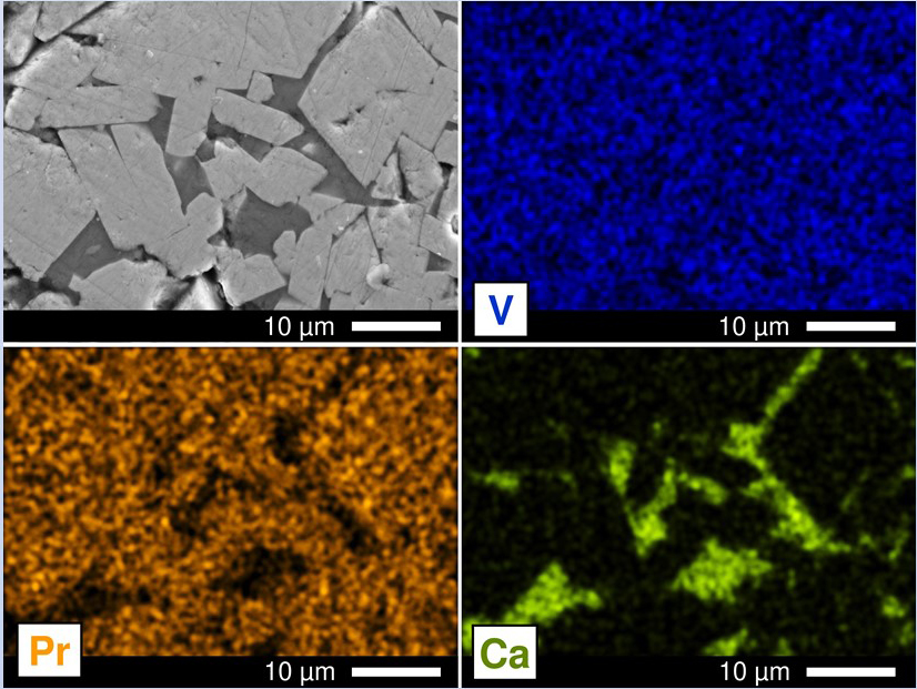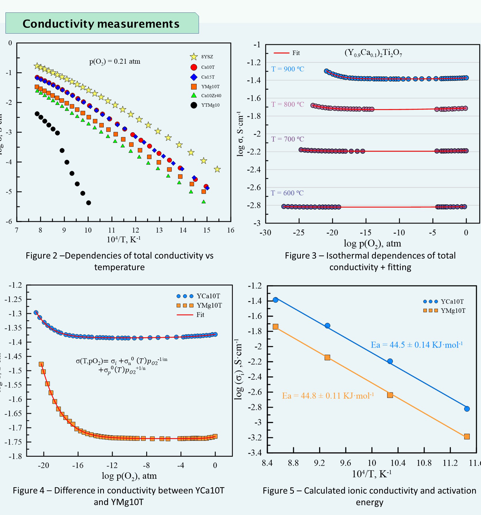 Twitter PosterLnVO4 orthovanadates attract attention as prospective materials for electrochemical applications, in particular, as redox-reversible electrode components for solid oxide fuel cells (SOFC) [1,2]. One important advantage of LnVO4-derived components of SOFC anodes is their good resistance to carbon deposition and sulphur-containing impurities which is critical for hydrocarbon-fueled SOFCs. The present work was focused on the impact of the acceptor-type substitution by calcium on the electrical transport properties of zircon-type orthovanadate PrVO4 under oxidizing conditions. Undoped PrVO4 and calcium-substituted Pr1-xCaxVO4-δ (x = 0.02-0.20) were prepared by conventional solid state route and sintered at 1300ºC for 5h in air. The prepared materials were characterized by X-ray and neutron diffraction, SEM/EDS, thermal analysis, and measurements of electrical properties in controlled atmospheres. XRD demonstrated the formation of phase-pure solid solutions with tetragonal zircon-type structure for up to 5 at.% of calcium in Pr sublattice, while SEM/EDS suggest a lower solubility due to the presence of Ca-V-O phase impurities. Pr(Ca)VO4 ceramics showed semiconducting behavior under oxidizing conditions at 400-900ºC. Within the solubility range, doping with calcium increases the total conductivity. The ionic and electronic contributions at 700-900ºC were assessed by the modified e.m.f. technique. The electronic conductivity is p-type and decreases with decreasing p(O2). At lower temperatures, the total conductivity was found to be higher in wet atmospheres compared to dry conditions, thus implying a significant contribution of protonic transport at temperature below 550ºC. The redox behavior of PrVO4-based ceramics on isothermal cycling between air and 10%H2-N2 was studied by impedance spectroscopy, thermogravimetry and XRD.