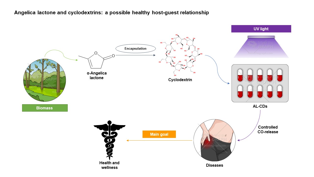 Twitter PosterCarbon monoxide (CO) is known for its toxicity. However, in small doses, it has tremendous potential to treat many diseases, which has led to the development of CO-releasing molecules (CORMs) for targeted CO delivery. Most of these compounds are organometallic complexes and, despite their promising pharmacological effects, there are concerns about metal toxicity. Organic metal-free CORMs (oCORMs) are expected to be less toxic than metallic ones. Here, angelica lactone (AL), a biomass derivative, is a potential oCORM since it is known to be susceptible to photodecarbonylation. The present study aims to fine-tune the CO-release properties of AL, and to enable a more controlled CO-release, by encapsulation of in nano- and macromolecular carriers, such as cyclodextrins (CDs). CDs have the capacity to improve the pharmacokinetic properties of encapsulated drug molecules, such as the solubility in physiological medium.