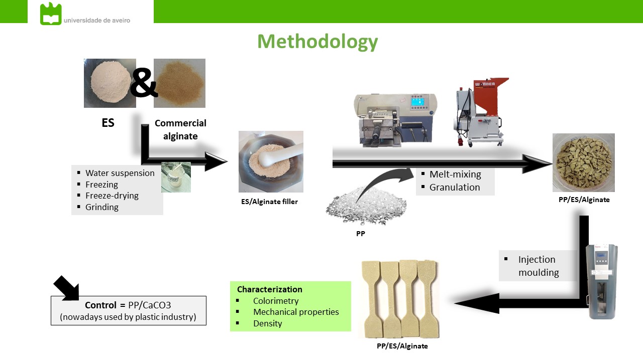 Twitter PosterPolysaccharides can be used to create lightweight ceramics. In turn, plastic industry uses non-renewable calcium carbonate (CaCO3) to reinforce their polymers, but their high density compromises the amount that can be added into the plastic formulation. Therefore, lightweight fillers for plastics are required. In this work, the feasibility of conjugating alginate with CaCO3 to develop low density fillers compatible with polypropylene (PP)-based formulations was studied. Following a circular economy strategy, eggshells-derived CaCO3 (ES) was used. The influence of the ES/alginate fillers on colorimetric, mechanical performance, and density of PP-based materials was studied using PP/non-renewable CaCO3-based plastics as a control group.