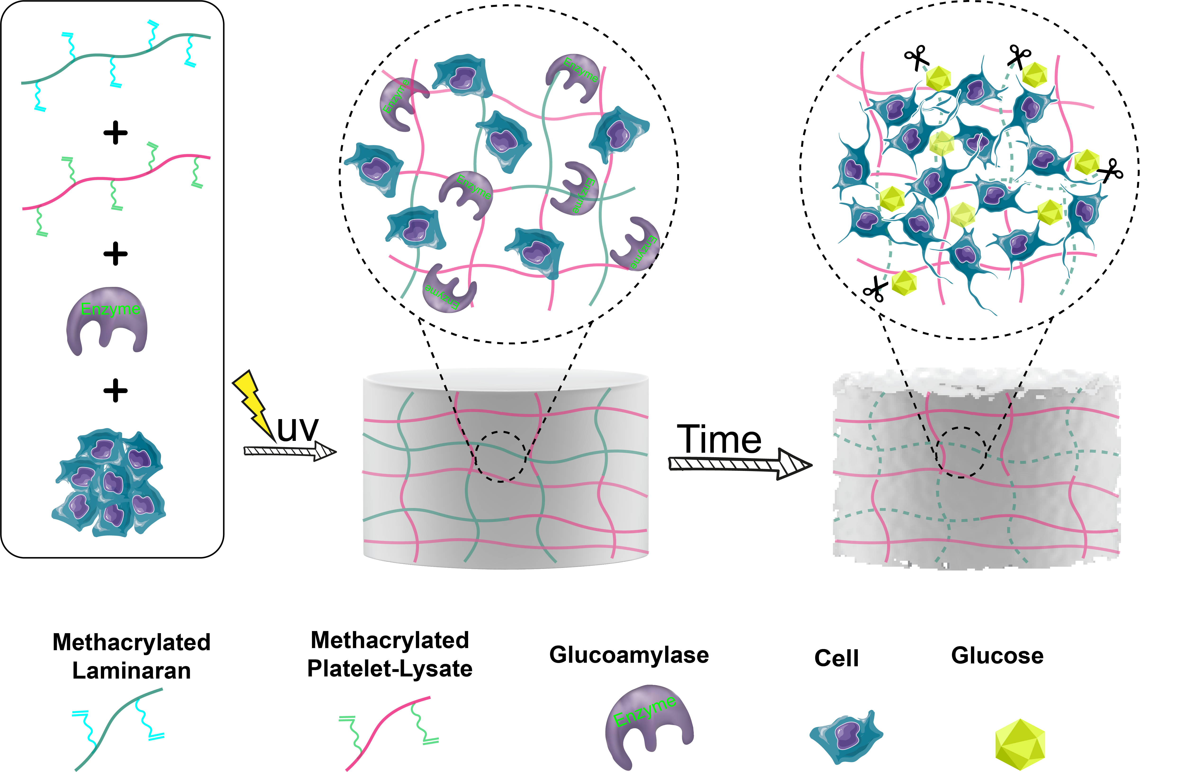 Enzymatically degradable hydrogel systems can be a powerful tool for the development of simple and robust cell laden constructs to promote the controlled outward cell migration into native tissues and foster the regeneration process. Laminarin is a new type of bioactive polysaccharide isolated from brown seaweeds that has been established as a promising biomaterial precursor due to its immune modulation, antitumor and antimicrobial properties. To this end, we fabricated enzymatic-empowered degradable laminarin hydrogels by encapsulating human adipose stem cells with adequate α-amylase concentrations. In a validation of this proof-of-concept, we have demonstrated that the increasing of α-amylase concentration in laminarin hydrogels increased its porosity, decreasing equivalently the swelling and the mechanical properties. In consequence, these properties have enabled the migration of cells from the hydrogel comparing with the control group with no encapsulated enzyme. Attempting to develop a safer, more convenient, and more applicable system in the clinical field, ongoing work includes the transition of this system to an injectable microgel system. We envision that the size of the obtained microgels around 115um not only will fulfill the oxygen diffusion limits in situ (which is between 100-200um), being therefore ideal for use in a delivery method, but also the injectable microgels will allow the repeated administration to foster the regeneration process in a minimally invasive manner