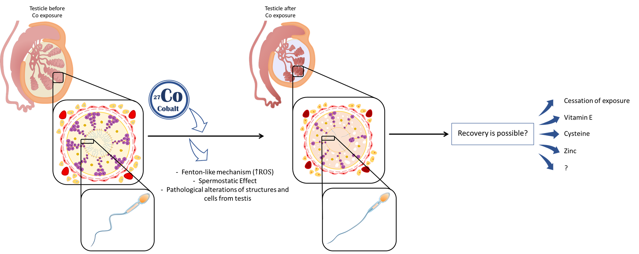 Cobalt is an essential trace element that is important at the cellular level, as it integrates the vitamin B12 complex. Despite going unnoticed, it has been increasingly used, from prostheses to rechargeable batteries, including as a metallic component of hardmetal tools (WC-Co).Although cobalt has an important biological role, excessive exposure has been shown to induce various adverse health effects. Among these, and although there is still much to uncover, are its effects on male fertility. Hence, this work aims to collect bibliographic information to better understand the influence of Co on male reproduction and how to reverse such effects. Data bases such as PubMed and Google were searched using key combinations: