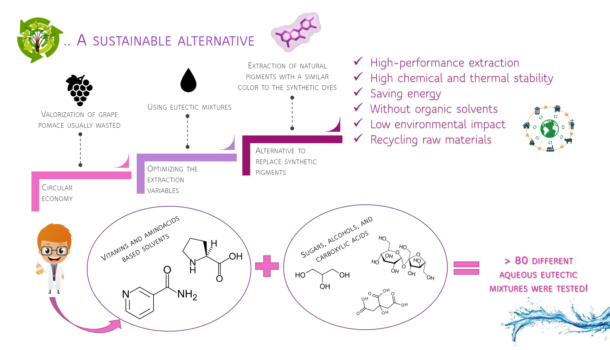In the biorefinery context, both bulk and specialty chemicals can be produced and extracted from biomass, resulting in a potentially more sustainable alternative to petroleum-derived products. An example of this is Haloarchaea, an interesting class of extremophile microorganisms, also present in the Aveiro salt pans. Amongst these, Haloferax mediterranei is a highly promising candidate to produce bacterioruberin owing to its rapid growth and ability to consume a variety of carbon sources. Bacterioruberin is an uncommon C50 carotenoid with great biotechnological interest. This type of carotenoid exhibits a higher antioxidant capacity than the C40 carotenoids such as β-carotene, which can be explained due to the higher number of pairs of conjugated double bonds. This makes this carotenoid remarkably interesting for the food, pharmaceutical and biomedical industries. In this work, the valorization of Haloferax mediterranei ATCC 33500 was pursued through the recovery of bacterioruberin and its separation and purification from the remaining cell components. To formulate food and cosmetic grade compatible extracts, pigment recovery was accomplished through the use of bio-derived eutectic solvents. Operational conditions such as the solid-liquid ratio, concentration of eutectic mixture, hydrogen bond-donor and hydrogen-bond acceptor ratio and the time of extraction were accessed. These eutectic mixtures arise as more sustainable and appropriate solvents compared to the typical solvents used in chemical processes because of their simple preparation, extraction efficiency and integration of the extraction and separation in a “one-pot” method by using water as counter-solvent.