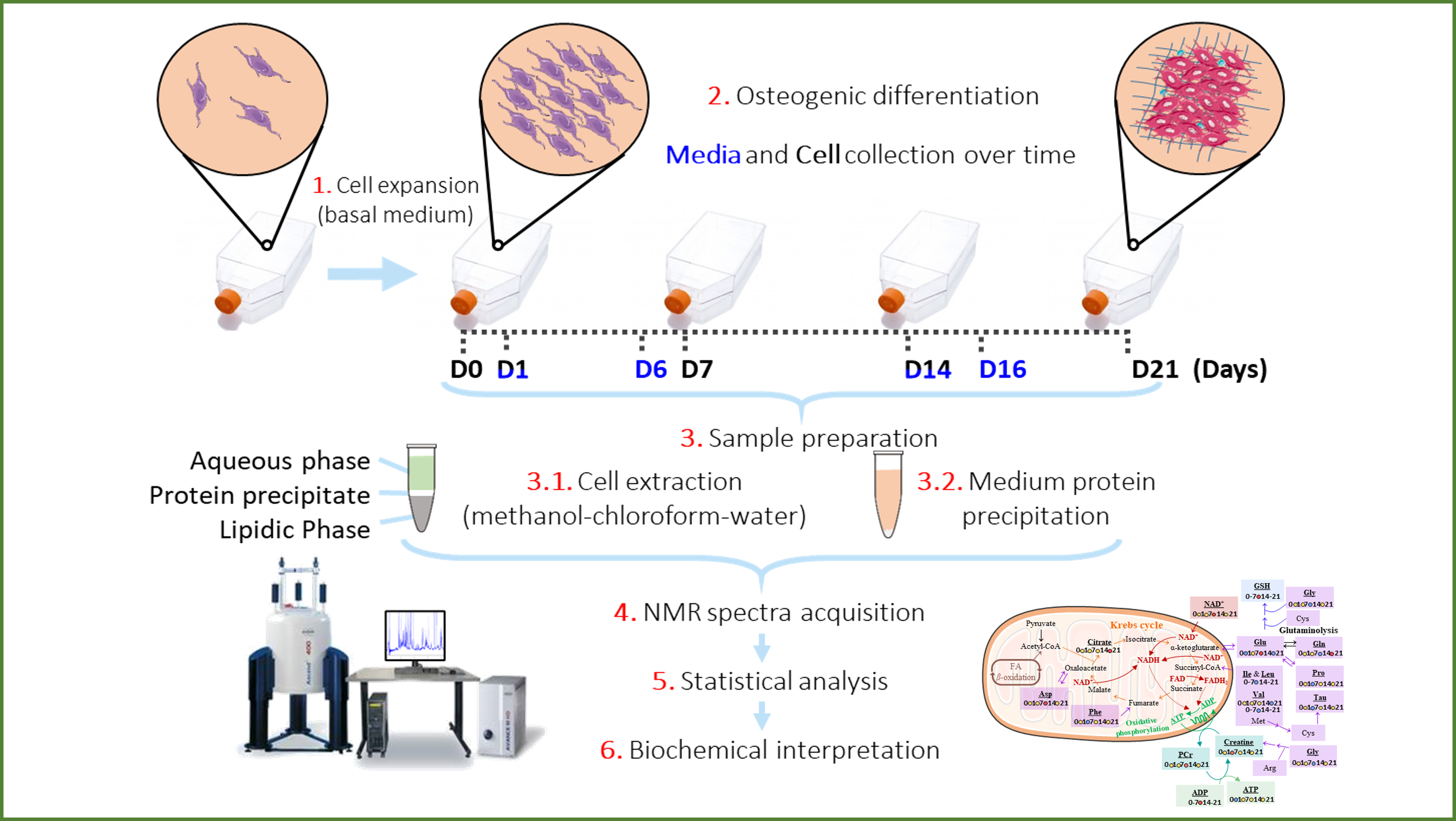 Mesenchymal stem cells (MSCs) differentiate into a variety of cell lineages, namely osteogenic, thus having great potential in bone regenerative medicine. Metabolomics offers exquisite insight into the metabolism of living organisms and, although some studies have already characterized MSC metabolome during differentiation, very few have monitored osteogenesis, with mass spectrometry approaches predominating [1-3] compared to nuclear magnetic resonance (NMR) spectroscopy [4]. Our aim was to unveil the metabolic pathways affected by osteogenesis. For the first time to our knowledge, we used untargeted 1H NMR metabolomics to analyse the polar endo-metabolome of human adipose tissue MSCs (hAMSC) throughout osteogenesis in 2D cultures (days 0-21). Our results showed significant differences over time in several endo-metabolites (including amino acids, creatine/phosphocreatine, choline compounds, among others). There was a clear metabolic separation before and after 7 days of culture. This work paves the way to characterize the dynamic metabolism during osteogenesis, ultimately enabling its monitoring through metabolic biomarkers, eventually translatable to in vivo clinical tissue regeneration strategies.[1] E. Alakpa, V. Jayawarna, A. Lampel, K. Burgess, et al., Chem. 1, (2016) 298.[2] M.Klontzas, S.Vernardis, M.Heliotis, et al., Stem Cells Dev. 26, (2017) 723.[3] M.H.Amer, M.Alvarez-Paino, J.McLaren, et al., Biomaterials. 266 (2021) 120450.[4] D. Gaur, Y.Yogalakshmi, S.Kulanthaivel, et al., Adv. Biosys. 2, (2018) 1800093.