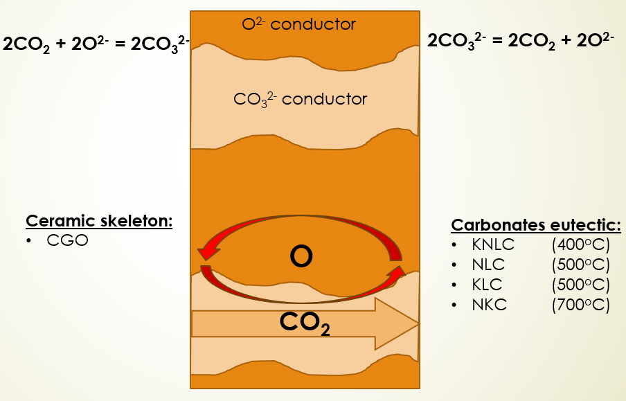 The power plants are one of the heaviest, in case of CO2 and other greenhouse gases emission, object. Nowadays there are three main approach for CO2 capturing, such as post-combustion, pre-combustion and oxy-fuel combustion. All these technologies require separation of gases in a different stage of energy production process. Thus, gas separation is an extremely important and fast developing scientific and industrial area aiming at removal of gas pollutant emissions.The main aim of the current work is improvement of the CO2 capturing composite membranes which consist of a porous oxide matrix and molten alkaline carbonates because it is a new and prospective material for CO2 separation membranes. Improving oxygen ion conductivity of the skeleton will results in direct improvement of the performance. Thus, noble ceramics such as bismuth oxide-based with outstanding conductivity are in scope of interest. Composites used in this work (distinct ceramic skeletons with molten salt impregnation) were studied by X-ray diffraction and impedance spectroscopy. The assessment of the chemical stability of distinct ceramic oxide-ion conductors in contact with carbonate mixtures complemented this study.