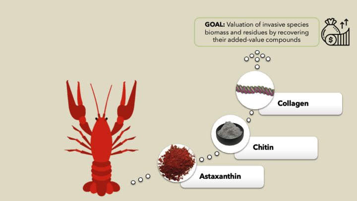 The red swamp crayfish Procambarus clarkii, native from EUA, is the most well-established invasive species in Europe, becoming the major biodiversity threat of freshwater systems 1. The success of their environmental compatibility is related to high plasticity, borrowing activity, ability to integrate into the food web at many levels and low predation rates 2. In spite of the several and diversified methods that have been proposed or used, all have high costs and noneconomical return 3. The exoskeleton of P. clarkii is composed by chitin (15-20%), proteins, including pigments (25-40%) and calcium carbonate (40-55%), which represents a considerable source of these biocompounds with biotechnological relevance. In this way, we propose the development of sustainable efficient techniques to extract astaxanthin, chitin and collagen from the invader P. clarkii in order to enrich environmental management strategies with an economic resource that can support the removal of the crayfish from invaded ecosystems.