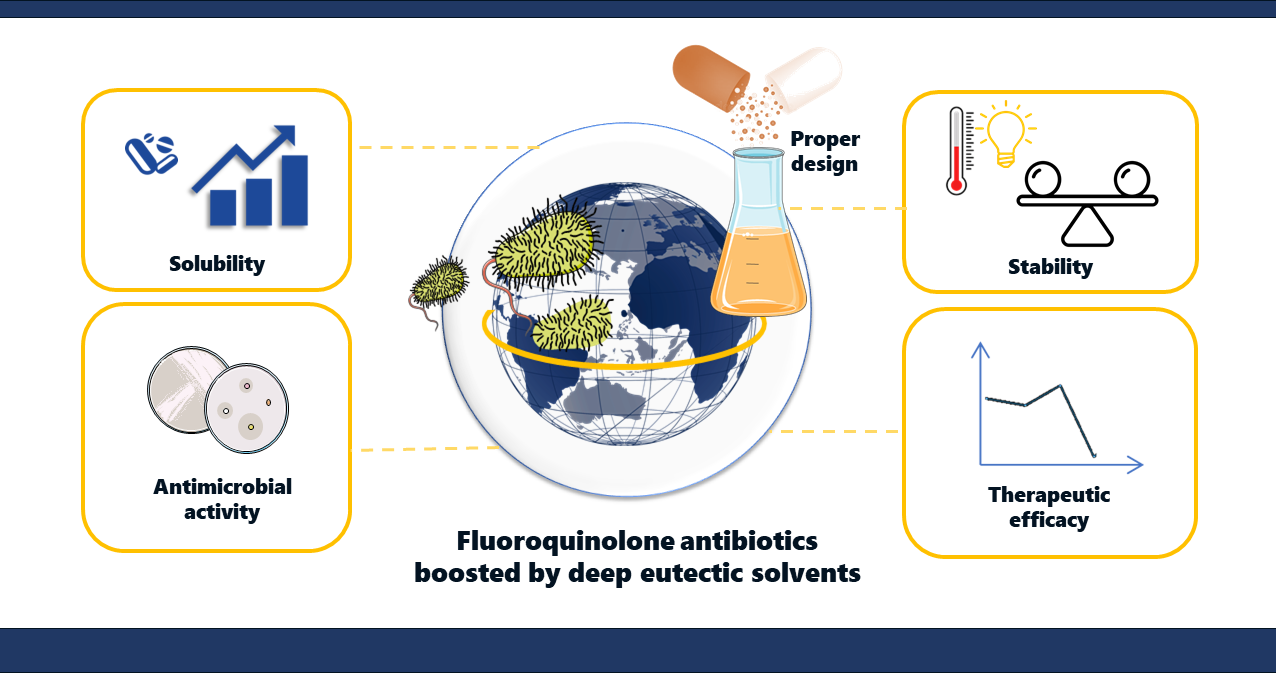 Antibiotic resistance threatens global health and security, as common antibiotics lose antimicrobial activity. To keep these therapeutic options available, new approaches to improve common antibiotics efficacy are mandatory. From the existing formulation alternatives, deep eutectic solvents (DES) have recently emerged as promising options to improve drugs performance. In this work, we designed DES that are capable to solubilize fluoroquinolones and investigated their impact in the solubility, stability, bioavailability and therapeutic action of the ensuing antibiotic solutions in DES. According to the obtained results, a two-fold increase in the antibiotics’ solubility and a remarkable effect on the inactivation of resistant bacteria was observed. The cytotoxicity and therapeutic efficacy of these novel liquid fluoroquinolone formulations was additionally conducted to infer their safety and ability to improve treatment infections, and their performance was compared to the commercial versions of the antibiotics. After incorporation in biopolymer-based systems different drug delivery options could be prepared with controlled release profiles for different administration routes.