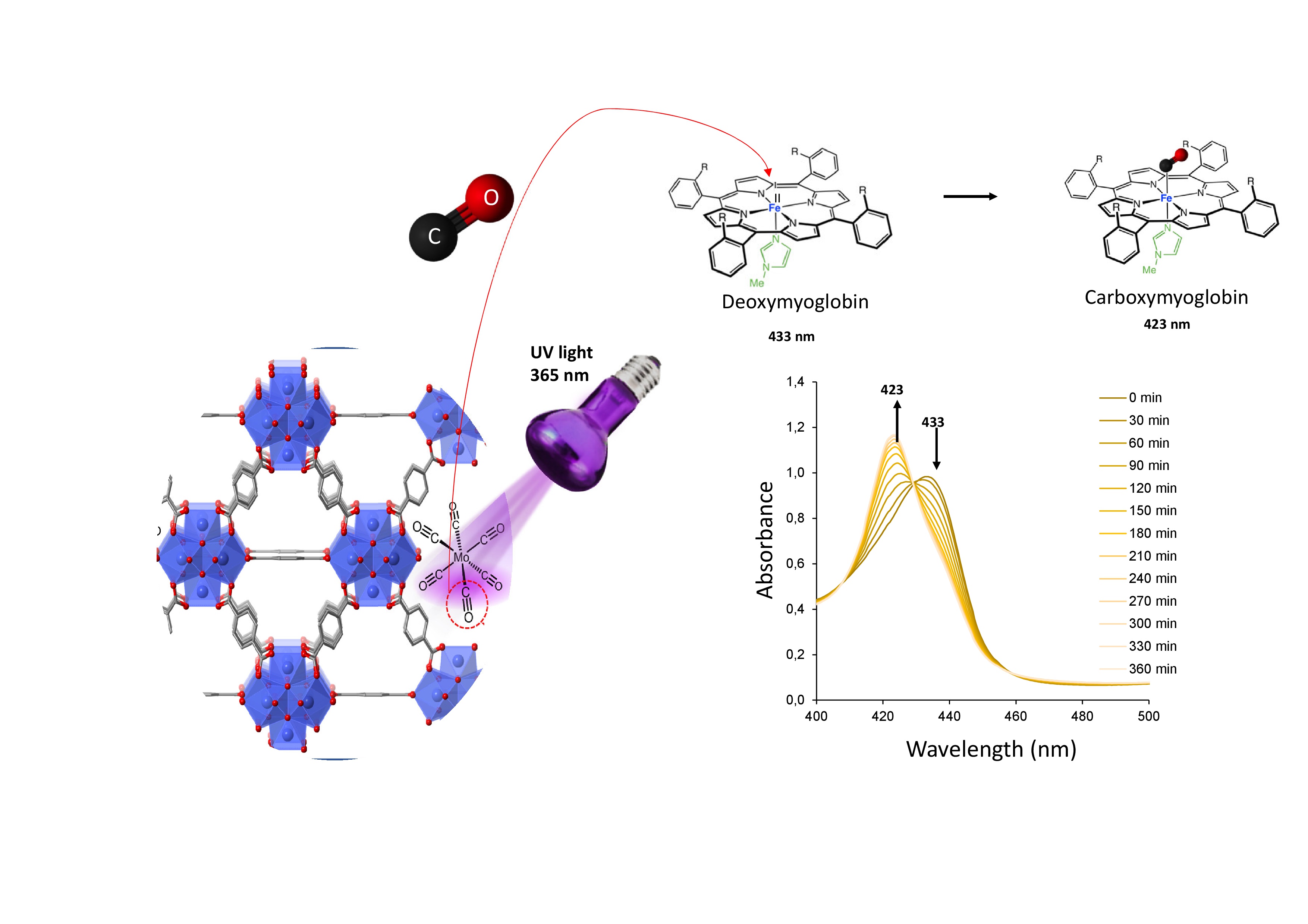 The inclusion of molybdenum hexacarbonyl in a hafnium-based metal-organic framework (MOF) with the UiO-66 architecture afforded carbon monoxide-releasing materials (CORMAs). The supported materials, which contained 6.0–6.6 wt% Mo, were characterized by powder X-ray diffraction (PXRD) and SEM coupled with energy dispersive X-ray spectroscopy, showing no alterations in their crystallinity nor morphology. The N2 physisorption isotherms revealed a 20% reduction in the micropore volume after encapsulation of Mo(CO)6. The presence of encapsulated Mo(CO)6 complexes was supported by FT-IR and 13C{1H} cross-polarization magic-angle spinning NMR spectroscopies. The suitability of these materials to behave as CORMAs was investigated under simulated physiological conditions (37 °C, pH 7.4 buffer). Carbon monoxide (CO) release was quantified by the standard myoglobin (Mb) assay. While stable in the dark, the supported material Mo(6.0)/UiO-66(Hf) released a maximum amount of 0.26 mmol CO per gram upon irradiation with UV light (365 nm). Leaching tests showed minor losses of molybdenum (<1%). The strong capacity of the support to trap Mo(CO)6 and decarbonylation fragments was attributed to the high chemical stability of the MOF, as confirmed by PXRD and FT-IR spectroscopy.
