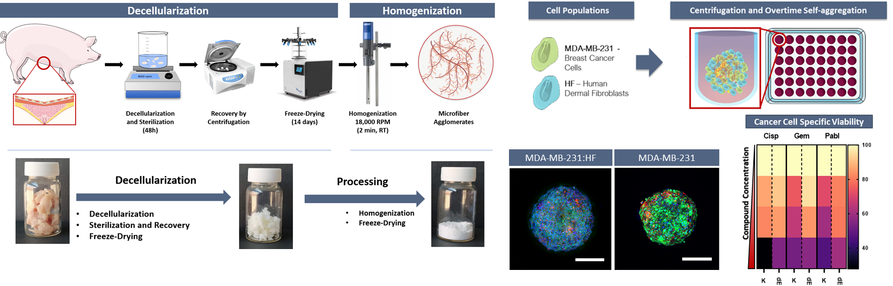 Decellularized extracellular matrix (dECM) is emerging as a valuable tool for generating 3D in vitro tumor models. Herein we employed microfiber processed dECMs for bioengineering 3D breast cancer spheroid models presenting key cellular and matrixial stromal components assembled in ULA surfaces. Providing reproducible and high-throughput compatible spheroid-shaped microtissues for in vitro drug screening. Herein, we engineered mono and co-culture 3D-MCTS containing dECM fragments derived from porcine mammary tissue. These dECM-enriched models promoted altered invasive and chemo-responsive profiles in cocultured populations. Increasing therapeutic resistance in cancer cells co-cultured with fibroblasts and promoting altered metabolical profiles.
