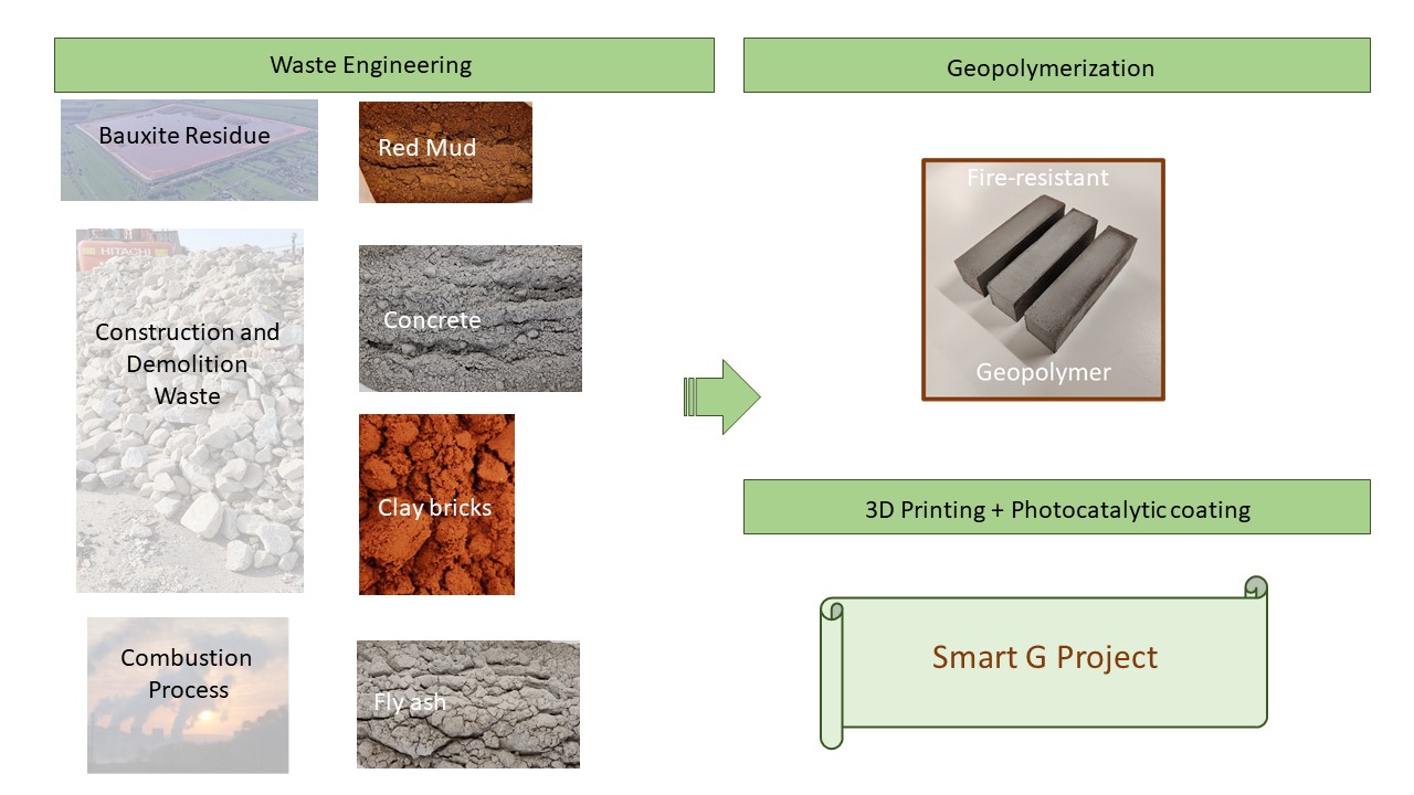 Geopolymers arise as an environment-friendly alternative to common building materials such as those derived from Portland cement. The geopolymer production allows the incorporation of various industrial waste streams being this particularly relevant under the circular economy paradigm. The demand of materials, namely those based on aluminium, increased the generation of waste materials associated with the extraction and refining processes of bauxite. To obtain one ton of alumina, the discharge of red mud can be around 0.6-2.5 ton depending on the raw material quality and the process used. The construction sector is also known to be one of the main sources of waste in Europe contributing with around one third of the waste generated. The recycling of construction and demolition waste can play a major environmental role: it reduces the consumption of energy, natural sources, emission of CO2 and promotes the achievement of recycling goals according to the Waste Framework Directive. SMART G is a European project, under the ERA-MIN 2019, that aims the development, production, and demonstration of lightweight, fire-resistant components for the construction industry. Industrial residues will be valorized via geopolymerization and turned into fire resistant materials, avoiding the most common destinies such as downcycling or landfilling. In this project, the different waste streams will be combined in the right proportions, after physico-chemical pre-treatment, to produce a high-performance material envisioned for the construction sector.