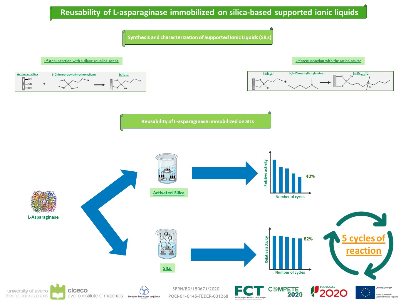 L-asparaginase (ASNase) is an aminohydrolase enzyme used as an anticancer drug, e.g. in the treatment of acute lymphoblastic leukemia, in acrylamide reduction and in biosensing. Nevertheless, its low stability and thermolability, and susceptibility to proteases, hinder its application in the health and food industries. Hence, the improvement of its properties through efficient immobilization methods is in high demand. Thus, this work aims the development of silica-based supported ionic liquids (SILs) for the ASNase immobilization to improve its stability and enable its reusability. While activated silica with no ILs only kept total initial ASNase activity during the first cycle of reaction, SILs allowed 5 cycles of reaction, keeping 82% of initial ASNase activity, reinforcing their potential as alternative enzymatic supports.