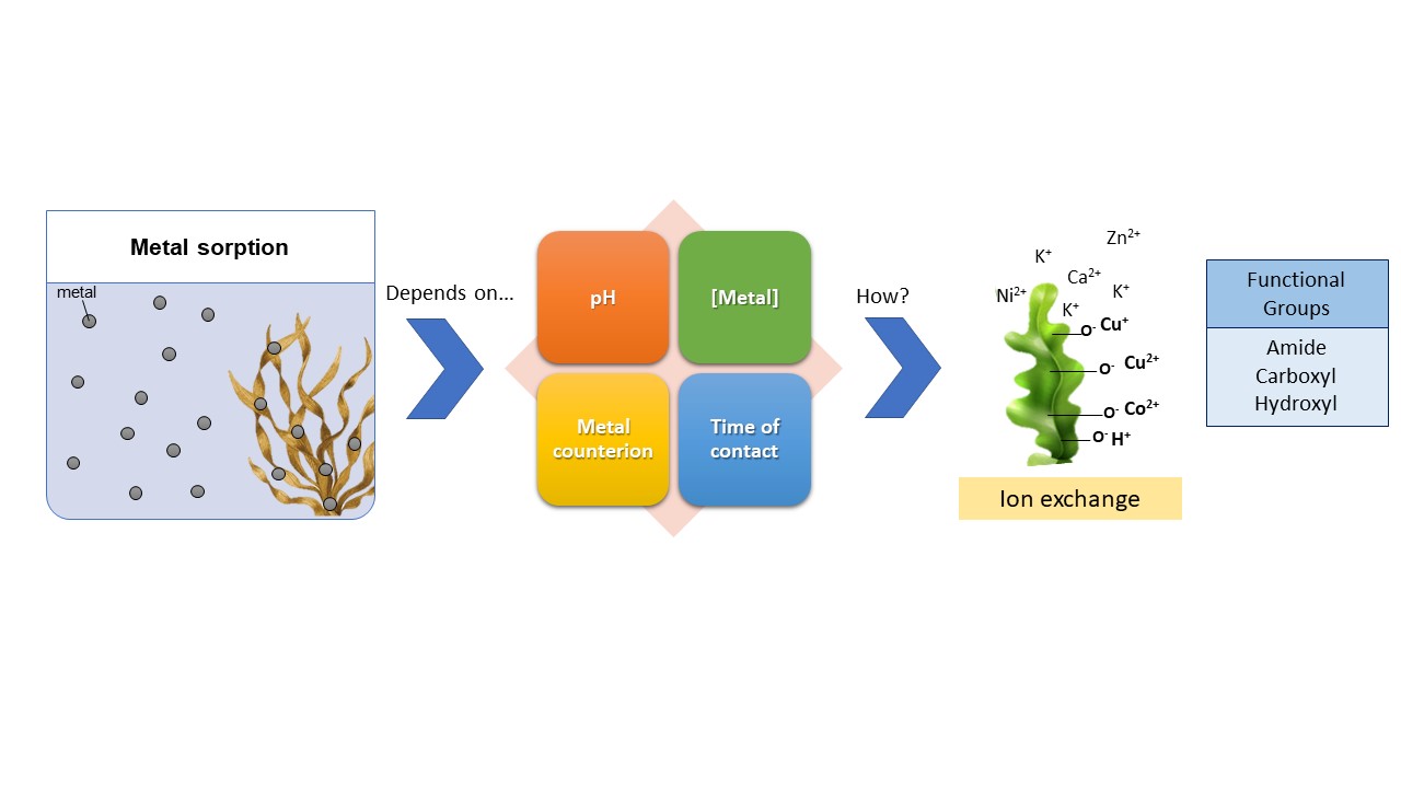 Twitter PosterThe development of civilization is putting pressure on the natural reserves of essential compounds, such as metals. If the rate of metal exploration does not decrease, it is likely that some metals will be depleted leading to severe supply and demand constraints. To prevent this, it is necessary to find alternative metal sources, such as wastewaters, electronical waste and acid mine drainage waters. It is urgent to develop a novel and sustainable approach for the recovery of metals from secondary sources. Bioremediation is a naturally occurring process that can be used to preconcentrate metals present in wastewaters. To enable this, it is necessary to optimize the sorption process to ensure the maximum amount of metal per gram of biomass, which will reduce costs and increase the efficiency of the process. To optimize this process, eleven varieties of biomass were studied in this work – namely cyanobacteria, macroalgae and microalgae – to determine the best adsorbent. Parameters such as pH, initial metal concentration, the metal counterion and the sorption kinetics were studied to better understand and optimize the biomass sorption capacity of metals. Ionic exchange between transition metals and soft metals, as Ca2+ and K+, was evaluated to see if a correlation could be found. Fourier-transform infrared spectroscopy (FTIR) was performed on all varieties of biomass to examine the types of functional groups found on the biomass.
