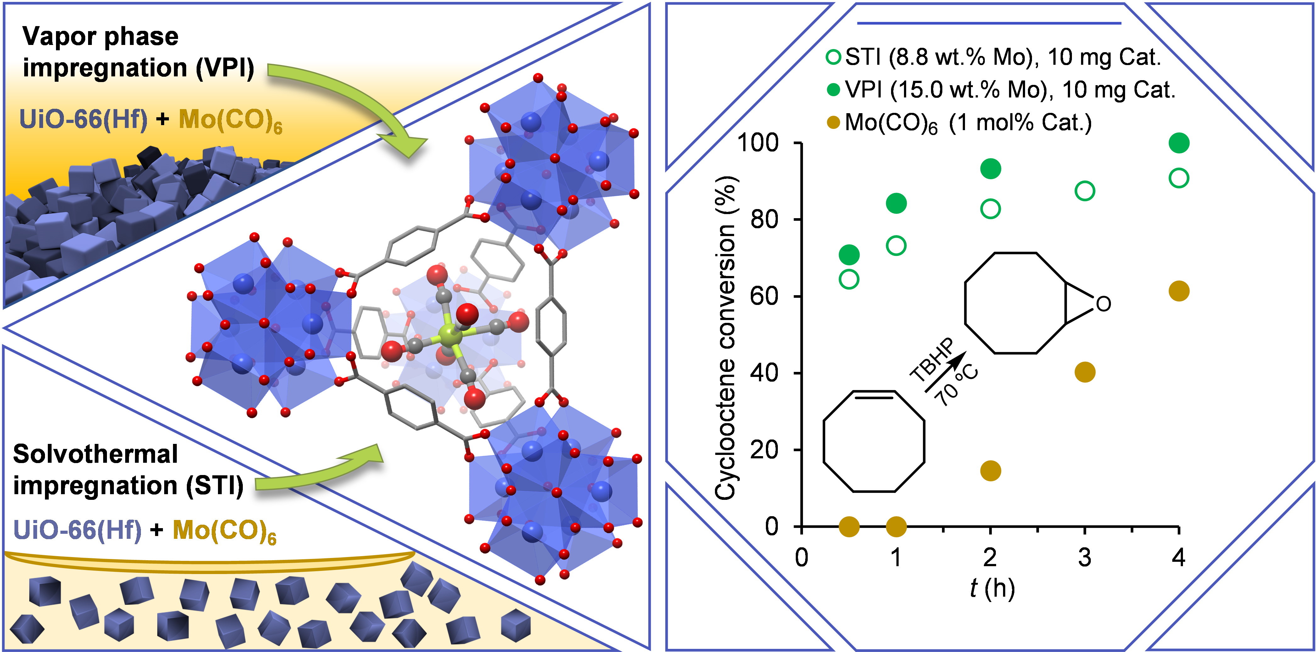 Metal-organic frameworks (MOFs) are three-dimensionally structured porous crystalline materials built from the interconnection of metal ion or polymetallic clusters and multitopic organic linkers. Recently, hafnium-based MOFs have been attracting growing interest, particularly HfIV analogues of UiO-66(Zr). Hf-based MOFs have higher Brønsted acidity than their isostructural Zr-based counterparts due to the higher oxophilic character of the hafnium(IV) center (stronger M‒O bonds). For these reasons, when comparing isostructural Hf/Zr-MOFs, it has been suggested that Hf-based materials may display higher chemical and thermal stability, and perform better as chemical sensors, heterogeneous acid catalysts or as sorbents for gas storage and separation.In this work, UiO-66 (zirconium and hafnium) MOFs were prepared by an attractive fast synthesis method (ca. 30 min) and Mo(CO)6 was encapsulated in the resultant nanocrystalline supports by solvothermal and vapor phase impregnation methods (STI and VPI, respectively), resulting in Mo loadings of 2.0-8.8 wt.% (STI) or 15 wt.% (VPI). The confinement and catalytic behavior of Mo(CO)6 species inside the supports was investigated by means of multitechnique characterization (powder X-ray diffraction, SEM-EDS, N2 adsorption, FT-IR and 13C{1H} CP MAS NMR) and catalytic olefin epoxidation. The characterization results collectively confirmed immobilization within the pore spaces of the hosts, which maintained their bulk crystallinity and crystal morphologies. The Mo(CO)6 loaded MOFs are active and reusable pre-catalysts for cis-cyclooctene epoxidation, exhibiting excellent epoxide selectivity and tert-butyl hydroperoxide efficiency.