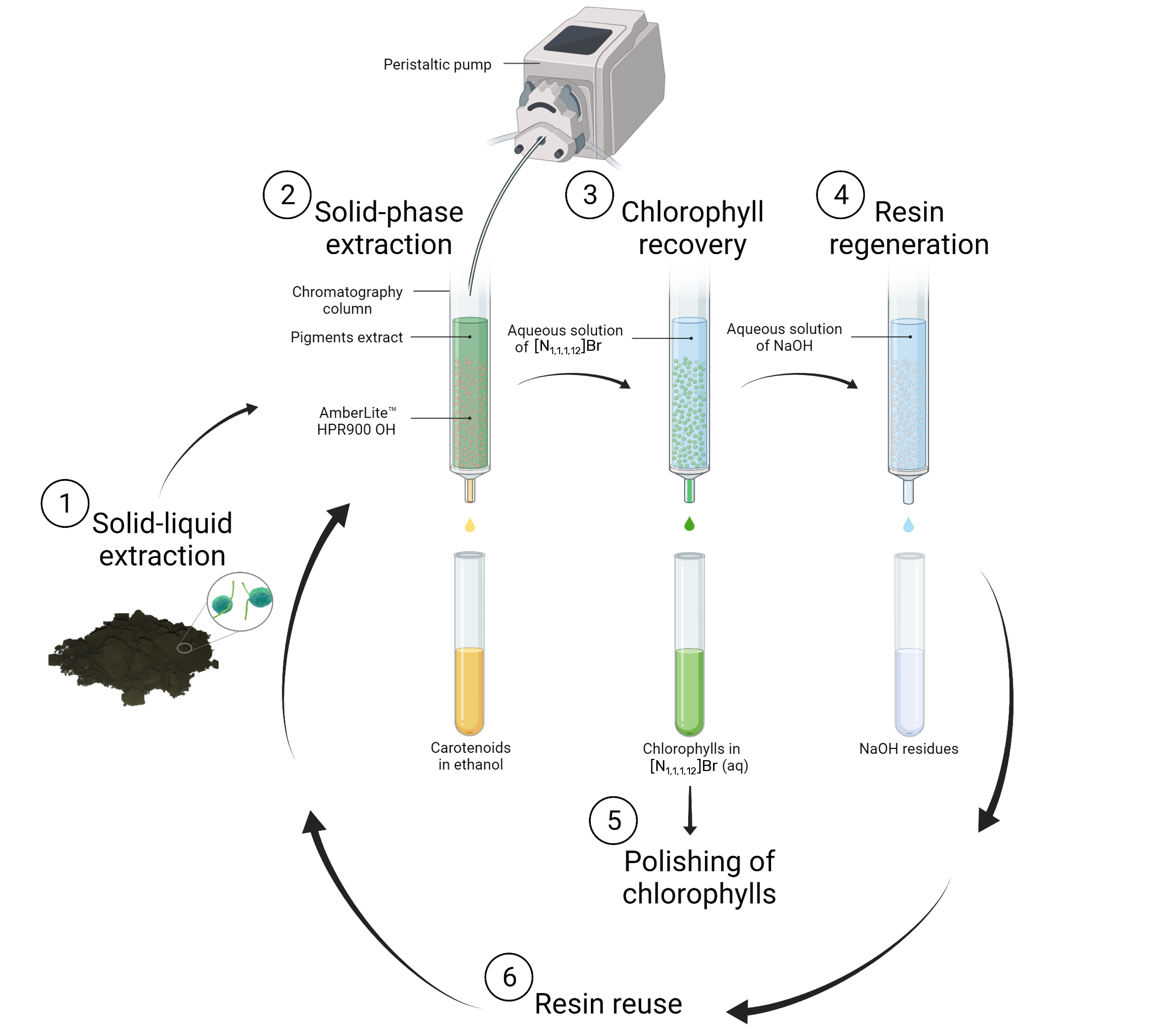 The move to a circular economy is in the near future. However, sustainable processes need to be developed to ensure the future of the planet. Thus, ionic liquids emerges as an alternative to organic solvents. Its effectiveness had been proven in the extraction of pigments from a liquid matrix. However, they were never used as eluents in solid-phase extraction processes. Under this context, aqueous solutions of ionic liquids were tested in chlorophyll elution from the commercial resin AmberLite™ HPR900 OH. After a solid-liquid extraction of chlorophylls and carotenoids from the microalgae Isochrysis galbana, a solid-phase extraction was performed. The carotenoids remained in the liquid extract while chlorophylls were adsorbed into the resin. However, since pigments are valuable natural compounds with many biological activities, and the valorisation of multiple compounds is the utmost importance, the recovery of chlorophylls was the focal point of this work. An optimization of the operational conditions by a response surface methodology and an evaluation of the possibility of resin reuse were assessed. It was found that the efficiency of the resin remained constant through five cycles of resin reuse, being able to recover 97.0 ± 0.9 % of the adsorbed chlorophylls. In addition, a procedure to recover the chlorophylls from the ionic liquid was developed, enhancing the loop closure. Finally, promising results were achieved when the process was applied in a continuous mode, being designed the process diagram for its potential application in the industry.