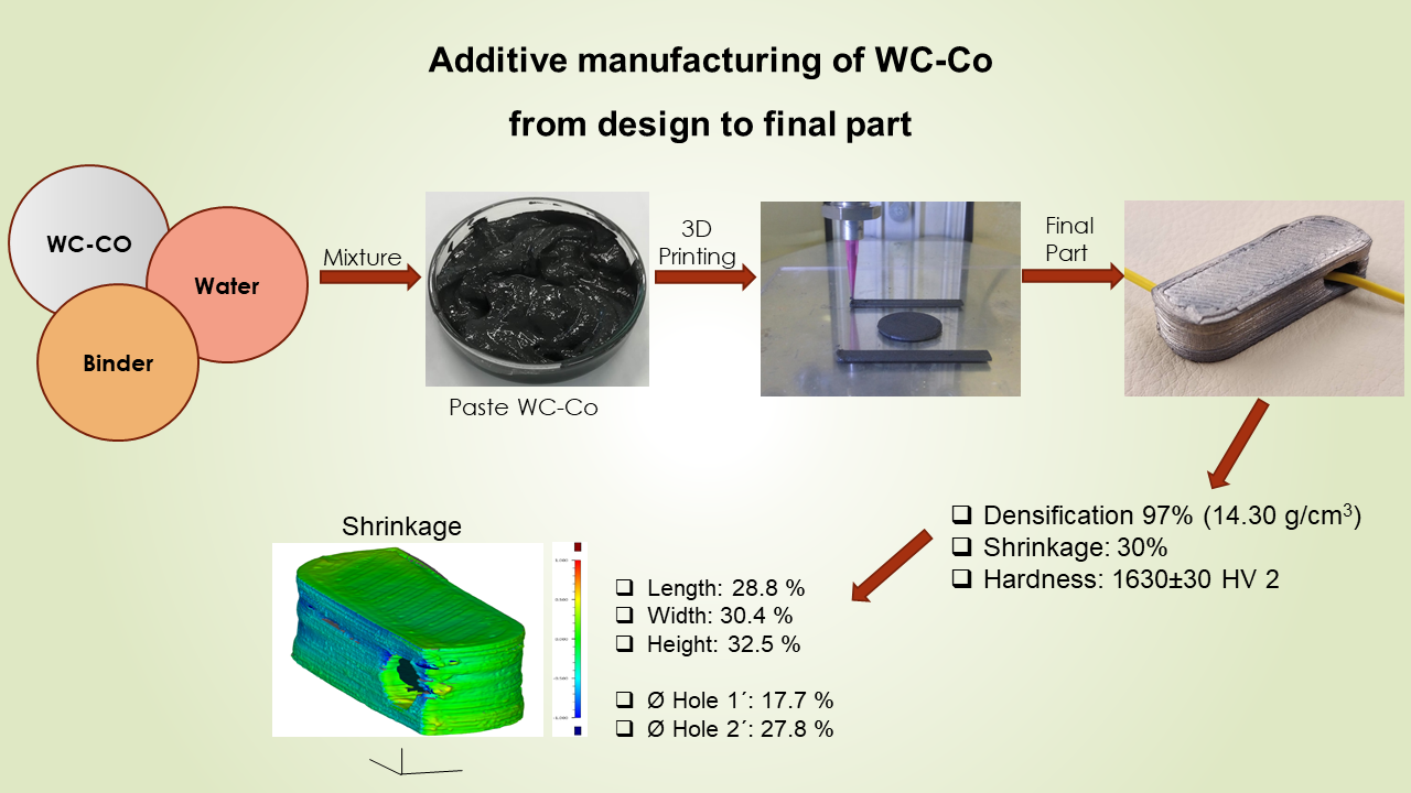 Additive manufacturing enables 3D freeform parts directly produced from a CAD file. It is a faster, cheaper and more eco-friendly process, with a unique capability to produce complex geometric parts without molds or milling. In this work, Robocasting is proposed as an innovation in the WC-Co manufacturing industry to produce freeform parts with a highly reliable and repeatable process.