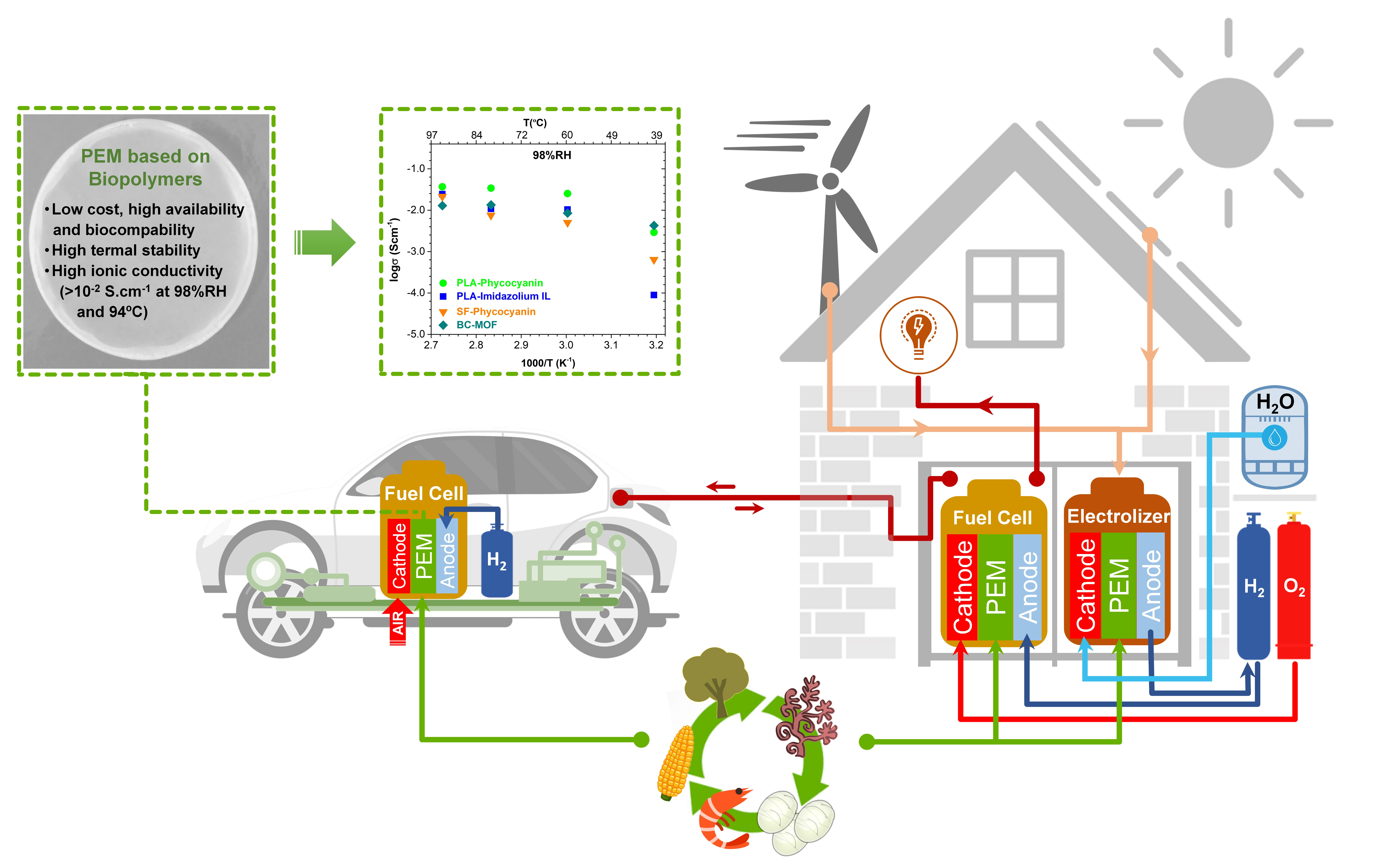 The Unitized Regenerative Fuel Cell (URFC) is an enabler technology which includes in the same device an electrolyzer and a Fuel Cell (FC). The former converts electricity in hydrogen and oxygen and the latter produces electricity on demand using the stored hydrogen and oxygen. The work developed by our group aims at developing a future generation of environmentally sustainable and low-cost materials for the production of renewable electricity using hydrogen as energy vector in URFCs. One of the key components of these devices is the Polymer Electrolyte Membrane (PEM). Hence, exploring low-cost, renewable, earth-abundant, natural materials for preparing PEMs is essential to the development of environmentally friendly electrochemical devices. Biopolymers such as, poly(lactic acid) (PLA), silk fibroin (SF), bacterial cellulose (BC), phycocyanin (PC) are examples of polymer matrices used for the preparation of PEMs with good physicochemical properties for application in URFCs.