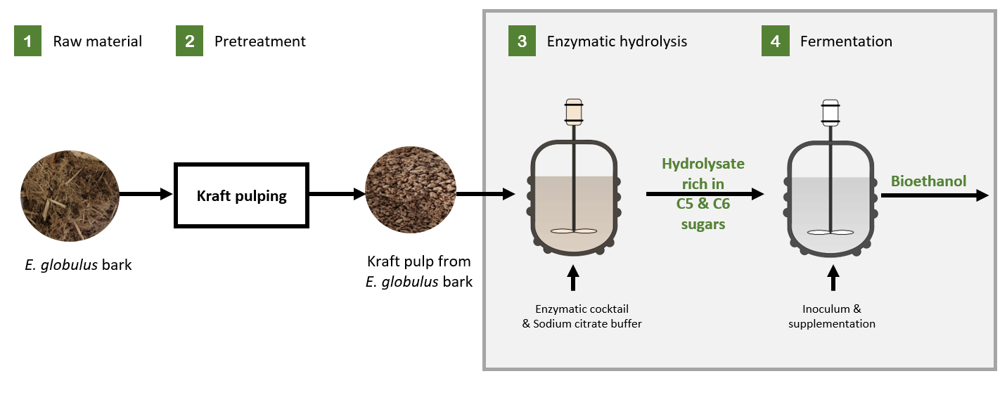 Eucalyptus globulus is recognized as one of the most widely used species in the pulp and paper sector. However, debarking is a crucial operation to ensure a high yield of the pulping process and quality of the pulp, which results in large amounts of this industrial residue. Typically, the bark is burned for energy purposes, although it can be converted into more profitable applications, contributing simultaneously to implementing the concept of biorefinery and the circular economy model. The conversion of E. globulus bark into cellulosic ethanol involved three main stages: pretreatment, hydrolysis and fermentation. The integration of cellulosic sugars and ethanol production into the pulp and paper sector leads to sustainable waste management, valorization of feedstock not suitable for pulp production, and boosts market opportunities. Also, this sector already has industrial facilities and logistics well established.The main achievements included the fed-batch strategy on the enzymatic hydrolysis step, resulting in a high-concentrated hydrolysate (about 160 g L-1 of cellulosic sugars). This hydrolysate was used for the fermentation process, achieving a maximum ethanol concentration of about 50 g L-1, corresponding to a yield of about 80%. Recently, a scale-up to 5L-bioreactor was carried out, achieving a similar performance compared to Erlenmeyer assays. This work proved that E. globulus bark kraft pulp could be a promising raw material for producing cellulosic sugars and ethanol.