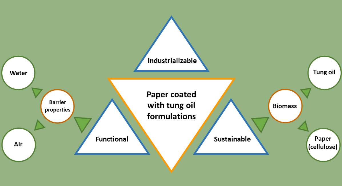 Packaging materials are widely used in our everyday life. The need for more sustainable packagings is increasing the use of paper packagings due to its biodegradability, recyclability, and availability. However, for paper to achieve its full potential as a packaging material, coatings derived from non-renewable sources are normally used, leading to the loss of paper’s biodegradable and sustainable character. Therefore, novel and more environmentally friendly coatings, capable of achieving the same (or improved) properties as those of non-renewable counterparts are of utmost importanceWith this in mind, new coating formulations were developed, based on tung oil, obtained from biomass. The impact of the type of photoinitiator (PI) was tested using formulations with two different PIs (Darocur 1173 and Irgacure 651), as well as two concentrations (5 and 10 wt%) and two paper substrates (base and commercial papers). Also, the effect on the coating pick-up was investigated by applying multiple coating layers (1, 2, and 3 layers). The samples were then irradiated with UV-light for 15 seconds with a radiance of 150 mW/cm2, and were fully characterized afterwards. The results show a considerable increase in paper’s gas and water barrier properties with the application of the coating and with the coating pick-up, without a significant difference between formulations with different PIs, nor different PI concentrations. The technology developed is of easy industrial implementation and can be a promising alternative to the fabrication of new and more sustainable packaging paper materials.