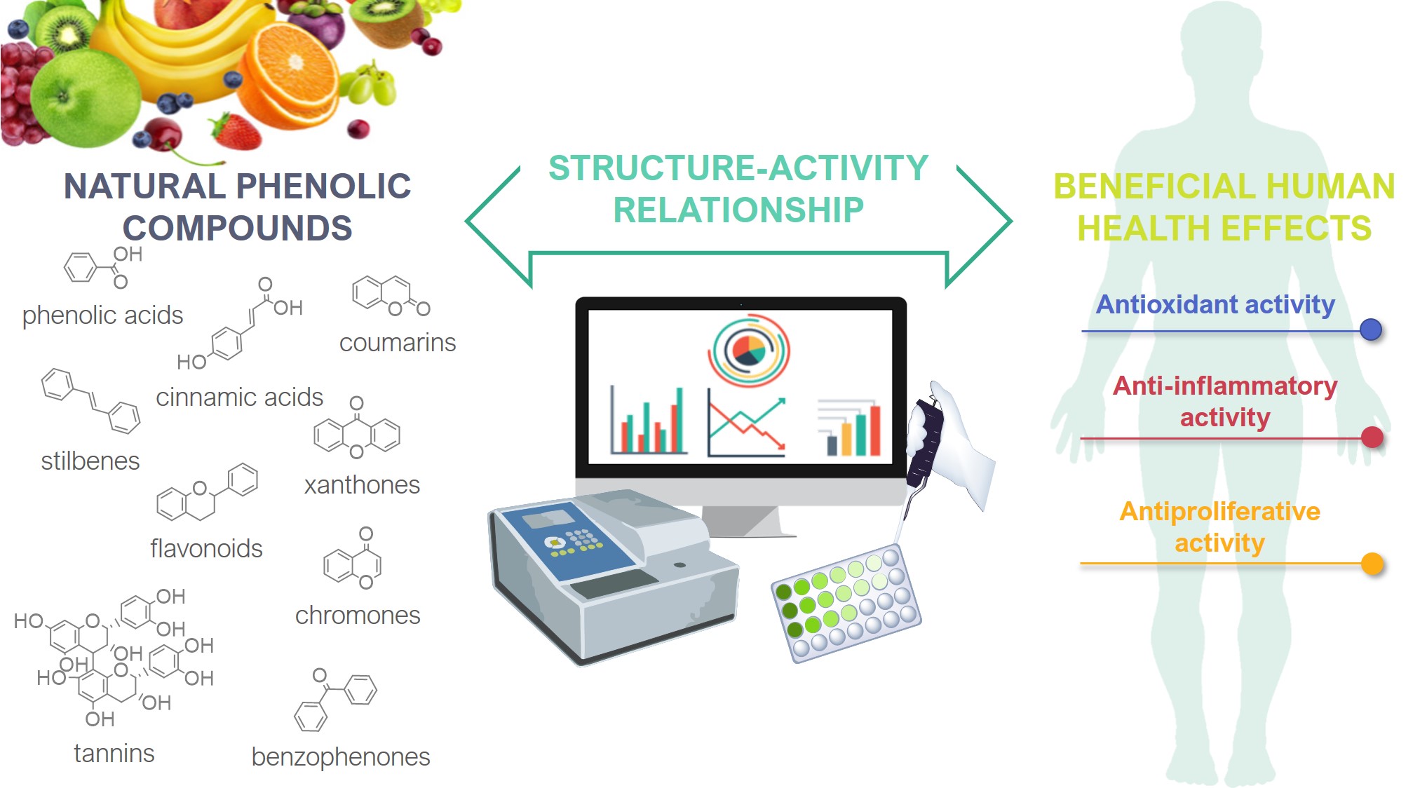 Phenolic compounds, commonly found in human diet, are one of the most structurally diverse and abundant groups of secondary metabolites in plants. They have been widely recognized by their promising effects on human health, namely in diseases prevention and control, due to their vast range of known biological properties, including antioxidant, anti-inflammatory and antiproliferative activities. Notwithstanding, there are some factors which could influence positively or not these beneficial effects, namely the compounds absorption from foods, metabolism and distribution in target tissues and cells –in particular, their bioavailability. In this vein, it becomes crucial to understand how their structural features influence on human health effects. Hence, this work aims to review phenolic compounds structures and biological activities in order to have a better knowledge about the structure-activity relationship and to take advantage of phenolic compounds promising human health effects.