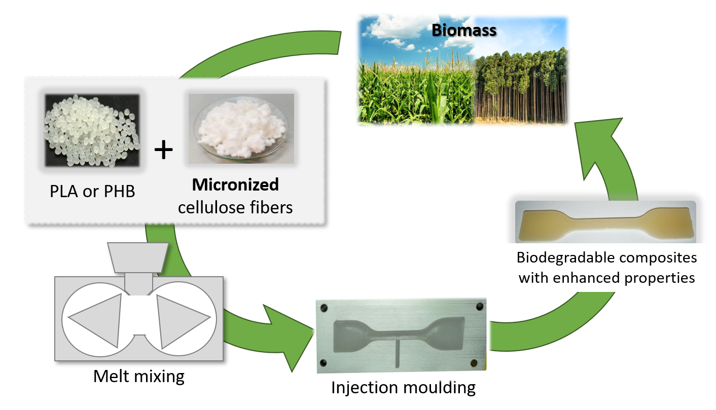 In recent decades, green composites made of biobased thermoplastics and natural fibers have emerged as sustainable alternatives for conventional glass fiber composites. However, the performance and processability of such composites are often insufficient. With that in mind, in the present work, epoxidized linseed oil (ELO) was used as an additive on green composites made of poly(lactic acid) (PLA) or poly(hydroxybutyrate) (PHB) reinforced with Eucalyptus pulp fibers with the aim to improve their performance and processability. The results showed that ELO acted simultaneously as plasticizer and coupling agent, decreasing the Young’s modulus and increasing the elongation at break and impact strength. The water uptake was negatively influenced by the addition of ELO and the biodegradation rate increased for PHB-based composites and decreased for the PLA ones. This additive also improved considerably the melt flow rate of the composites based on PHB, and hence their processability. Therefore, the use of ELO as additive in the production of green composites is a promising methodology to obtain biobased materials with improved performance.