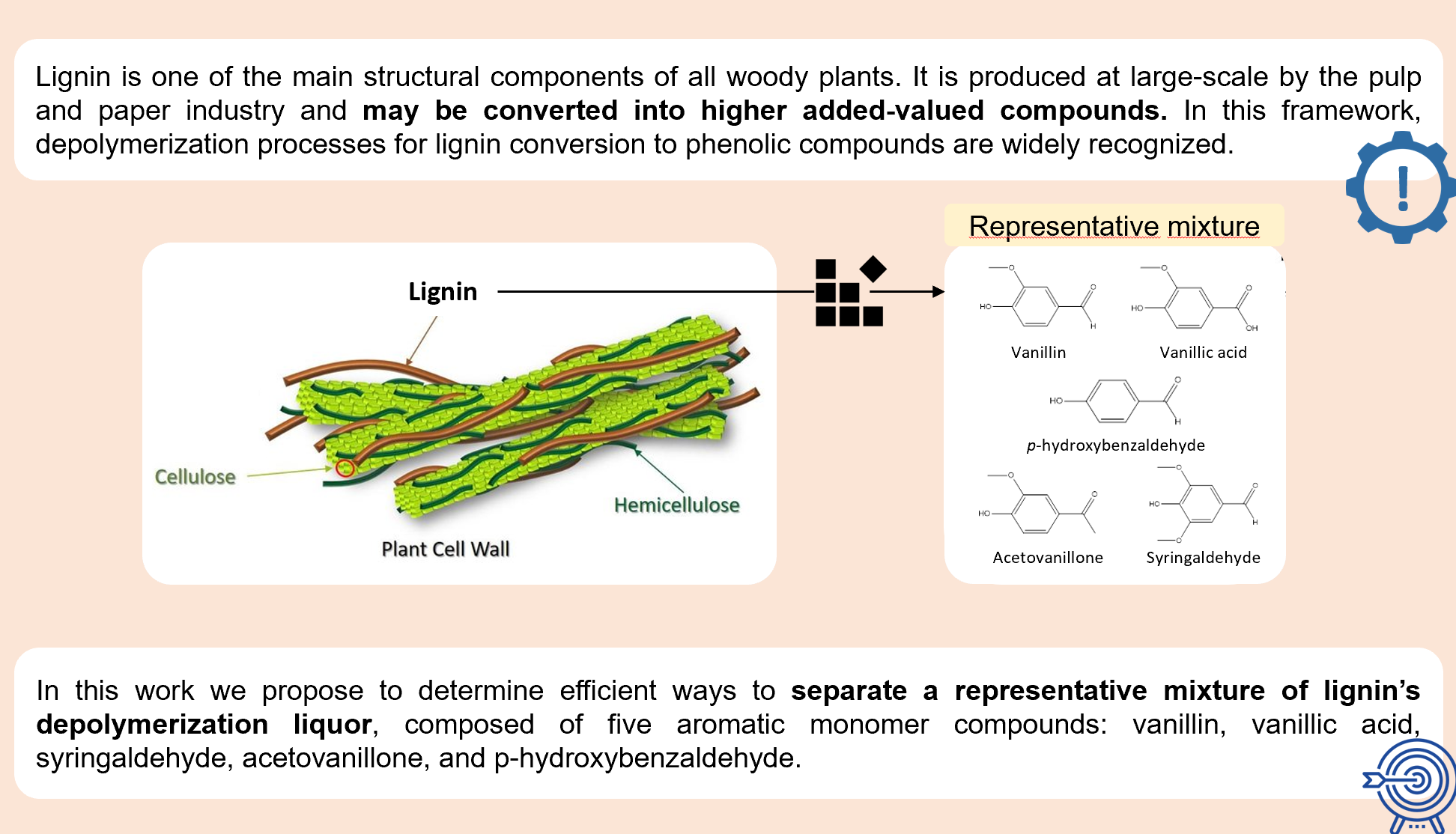 Twitter PosterLignin, one of the main structural components of all woody plants, is available at large-scale from the pulping liquor produced by the pulp and paper industry. Nowadays, pulp and paper mills largely burn this liquor in an integrated process to produce electric and thermal energy. Although this combustion is still a valuable contribution to reduce fossil fuels consumption, lignin offers perspectives for higher added-valued applications and could be converted into several profitable commodities, a key factor for creating economically feasible biorefinery processes. This is an opportunity to transform conventional pulp and paper mills into integrated forest biorefineries capable of producing new biochemicals and biomaterials. In this framework, depolymerization processes for lignin conversion to phenolic compounds are widely recognized. However, their high price, resulting from significant shortcomings of the lignocellulosic biorefinery processing, creates a significant drawback while simultaneously highlighting the need for more effective purification methods and downstream processes. Vanillic acid, known for its antimicrobial, antioxidant and antibacterial properties, is particularly valuable. As such, in this work we set out to determine efficient ways to separate and purify vanillic acid from a mixture of five model phenolic compounds frequently derived from lignocellulosic depolymerization, namely vanillin, vanillic acid, syringaldehyde, acetovanillone and p-hydroxybenzaldehyde. For such, aqueous biphasic systems (ABS) formed by polyethylene glycol, sodium polyacrylate, and inorganic salts or ionic liquids as electrolytes were applied, followed by the use of centrifugal partition chromatography (CPC) to reinforce the fractionation process scale-up. In single-step experiments, for the chosen optimal operational conditions, we were able to separate and purify our target molecule from the remaining phenolic mixture with a purity of up to 95%.
