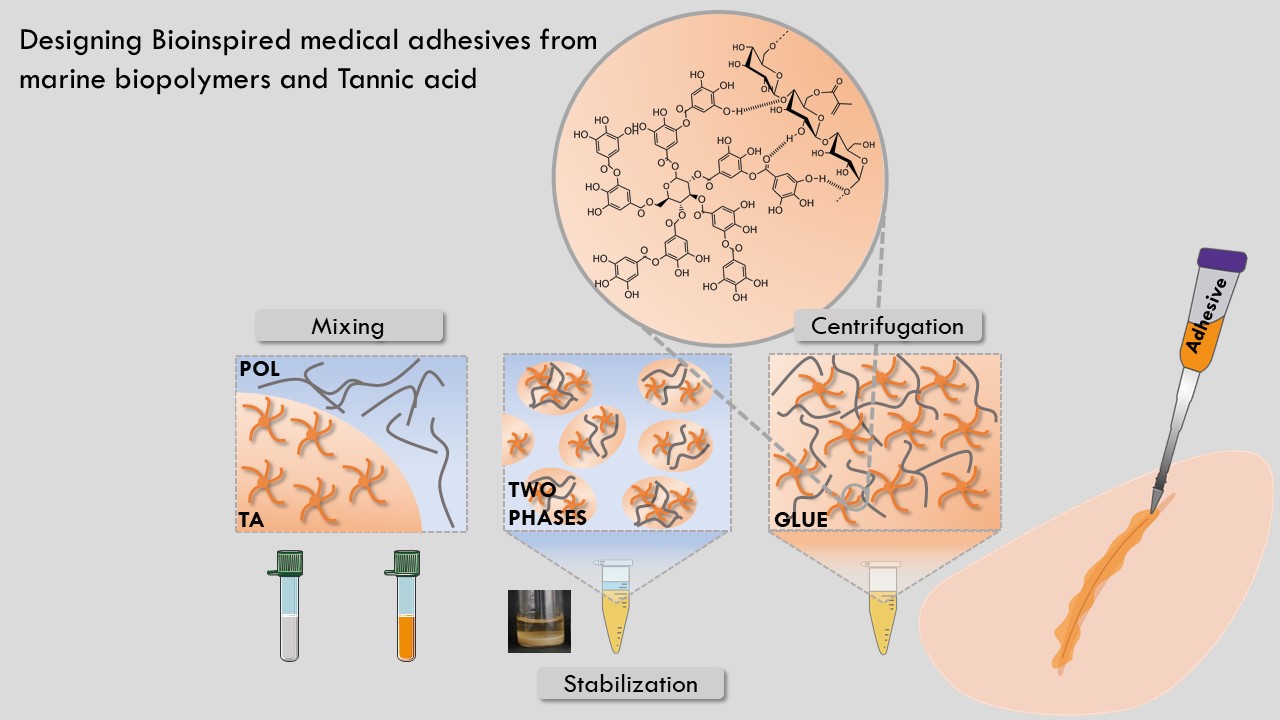 Adhesive biomaterials have been studied to serve as tissue sealants, hemostatic agents and/or accelerate the healing of several types of tissues. Currently available bioadhesives present drawbacks, such as harsh chemical reactions, low biocompatibility or weak wet-adhesion, limiting their biomedical application. To surpass the lack of biocompatibility, marine polysaccharides, have been extensively used to develop new biomaterials for biomedical purposes, since they promote cell proliferation and differentiation, as well as functional tissue formation. Regarding wet-adhesion, mussel-inspired bioadhesives have gained attention, mimicking the mussel´s strong underwater adhesion, using catechol groups in the compound’s structures. Tannic acid (TA), a plant-derived polyphenol, is a safe and low-cost source of catechol/pyrogallol groups. It allows polymeric crosslinking through hydrogen and ionic bonding, or hydrophobic interactions (graphical abstract), improving biomaterials adhesiveness and mechanical performance, while endowing it with anti-microbial, anti-inflammatory and antioxidant properties. Hence, by combining laminarin (LAM-OH) or pullulan (PUL-OH) with TA, bioinspired adhesive biomaterials for biomedical applications will be produced by supramolecular interactions.