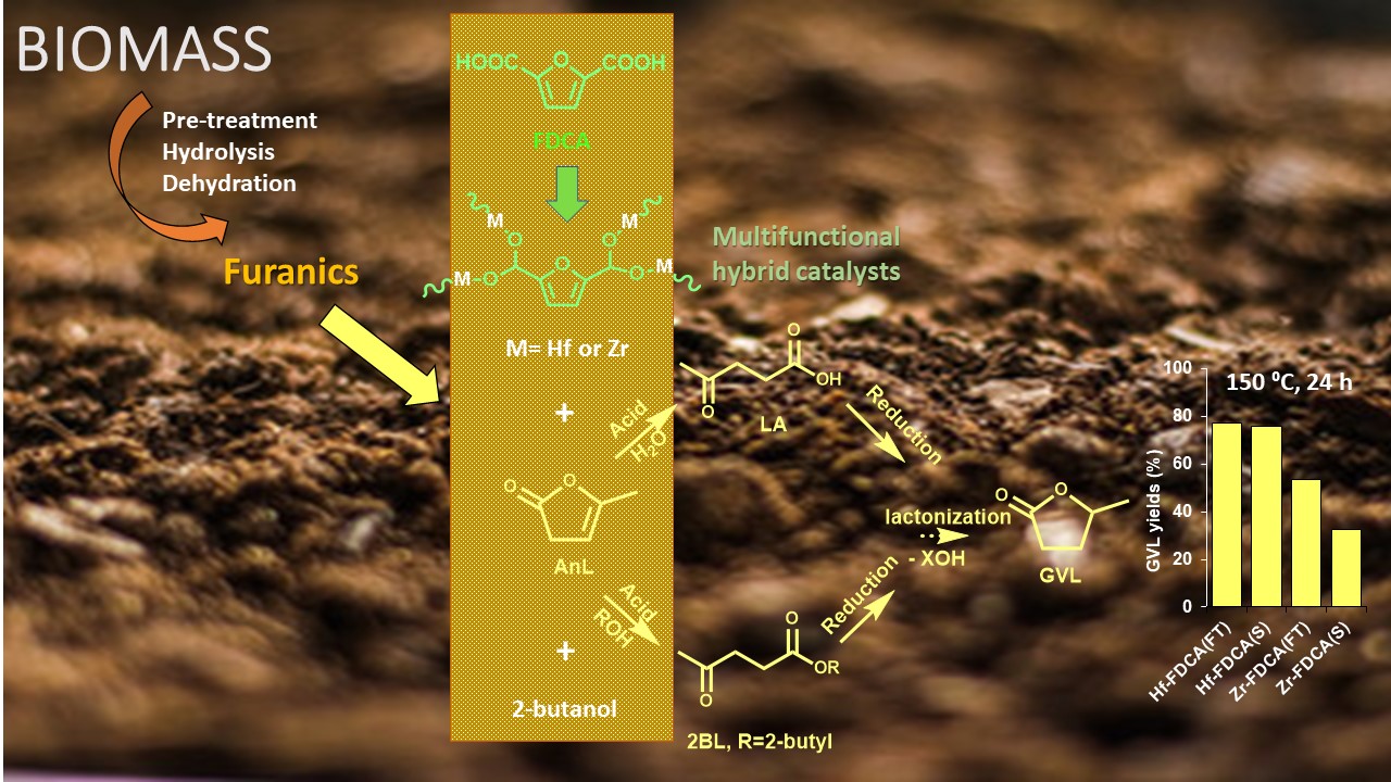 The increasing greenhouse gas (GHG) emissions associated with the extensive use on fossil fuels has a strong impact on climate change. In order to decrease the levels of GHG and answer to stringent environmental legislation, it is important to build a sustainable chemical industry. Vegetal biomass (VB) appears as a renewable alternative that can lead to bioproducts with potential to partly substitute petrochemicals. Carbohydrates are the main components of VB. Angelica lactone (AnLs) and levulinic acid (LA) are versatile carbohydrate biomass-derived building blocks of industrial interest. LA in particular is in the TOP 10 list of most valuable platform chemicals. In this work AnL and LA were converted to the bioproduct gamma-valerolactone (GVL) with several industry applications such as solvents, plasticizers, drugs, and fuel additives. For such an achievement nanohybrids with acid and reduction sites (M-FDCA) were synthesised from bio-based 2,5-furandicarboxylic acid (FDCA) and a transition metal (M= Zr or Hf) precursor through a simple and fast methodology (FT), and a conventional solvothermal (S) method. The Hf-FDCA catalysts were stable and performed superiorly to the Zr-FDCA ones, reaching 76-77 % and 33-53 % of GVL yield respectively at 150 ºC/24 h from AnL. From LA, the GVL yield reached 69 % for Hf-FDCA(FT) and 56 % for Zr- FDCA(FT). Increasing the reaction temperature to 180 ºC enhanced the reaction kinetics (Hf-FDCA(FT) led to 79 % GVL yield at 180 ºC/5 h).