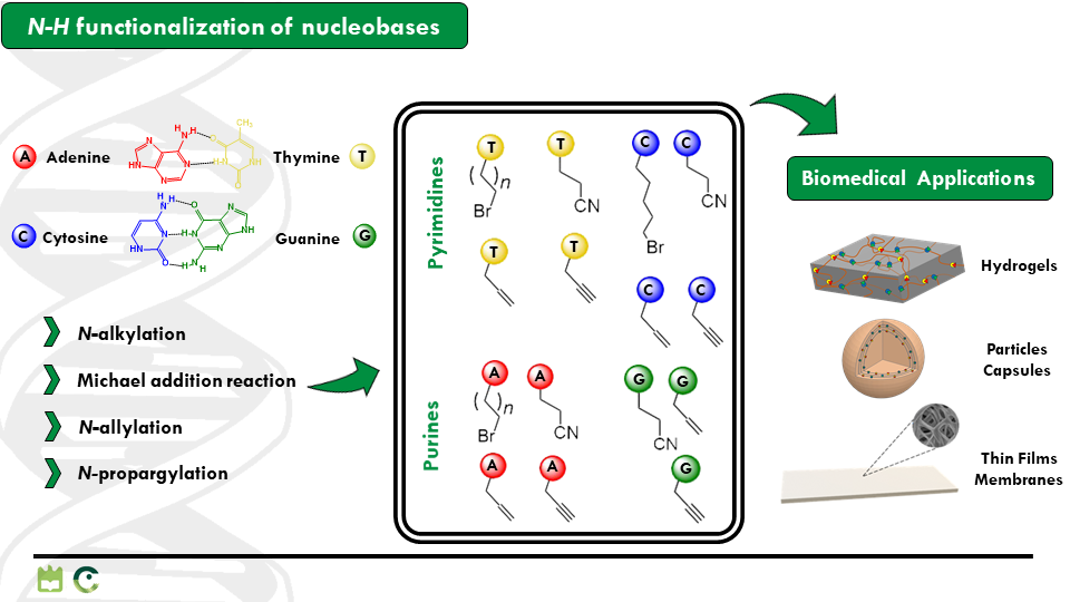 DNA is one of the most fascinating biomolecules in nature that has extended well beyond its classical key role on storing, encoding and conveying the genetic information in all living organisms through its basic molecular building blocks - adenine (A), guanine (G), thymine (T) and cytosine (C). Over the past decades, the interest in the rational design and development of DNA-based supramolecular nanoarchitectures has notably increased owing to the highly specific and selective interactions between complementary Watson-Crick base pairing. To date, several synthetic methodologies have been pursued towards the functionalization of DNA nucleobases. However, challenges such as preservation of nucleobases’ hydrogen bonding capabilities, successful introduction of functional groups in high yield and poor solubility in common organic solvents remain as major bottlenecks for modulating their reactivity, physicochemical and biological properties. Herein, simple and one-pot synthetic procedures have been implemented for producing a library of DNA nucleobase derivatives endowed with reactive functional groups for bioconjugation and crosslinking strategies with other (bio)molecules. The in vitro biocompatibility of the native and nucleobase derivatives was evaluated by culturing them with human fibroblasts, revealing their cytocompatibility. This new library of nucleobase derivatives holds great promise for being coupled to different biomolecules, including biopolymeric materials, lipids, and peptides, thus potentially leading to modular supramolecular biofunctional nanomaterials, including hydrogels, thin films/membranes and capsules for being used in a variety of biomedical scenarios.