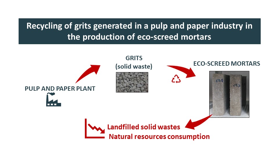 Grits are inorganic solid waste produced by the pulp and paper industry that are currently disposed in landfills, a process involving a high economic and environmental burden. This work investigates a more sustainable waste management strategy for this waste. After a screening process, grits were used as limestone substitute in the production of eco-screed mortars. The grits were characterized (SEM, XRD, XRF, particle size distribution). The influence of the grits incorporation amount was investigated in the fresh (workability) and hardened state (mass loss upon curing, bulk density, sorptivity by immersion and capillary, and flexural and compressive strength) properties of the screed mortars. The obtained results demonstrate that is possible to substitute up to 25 wt.% of limestone by grits in the screed mortars formulation, keeping the required properties. The successful incorporation of a waste in the screed mortar formulation promotes not only the decrease of natural resources consumption but also the reduction of solid wastes landfill amount, in line with the circular economy.