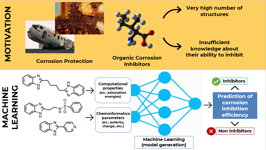 Corrosion inhibitors have an important role because they help to limit metallic corrosion, preventing the appearance of serious problems in these materials. Currently, there is a great interest in replacing protective compounds frequently used in the past, by organic corrosion inhibitors, as these can be modified to make them more environmentally friendly and without being associated with the high toxicity problems of previous solutions. However, the number of structures that can be obtained is extremely high, making it impossible to test all compounds experimentally, while the knowledge about their inhibition capacity is still insufficient, due to their high degree of complexity and all the factors that are involved in the corrosion process.In this work, a larger set of data was obtained from literature in comparison with previous works, which contributed to develop an open data management online tool that allows to compare different compounds and to facilitate the search for the most suitable inhibitors for the intended conditions. Afterwards, Machine Learning approaches were applied, considering different computational and cheminformatics descriptors, to predict the inhibition efficiency of organic compounds for aluminum alloys used in aeronautics applications. This approach can be useful to perform an initial virtual screen of potential compounds to be tested experimentally as inhibitors, thus reducing the time necessary to obtain the right corrosion inhibitor under specific application conditions. Moreover, it can be the core of a subsequent ML based online application.
