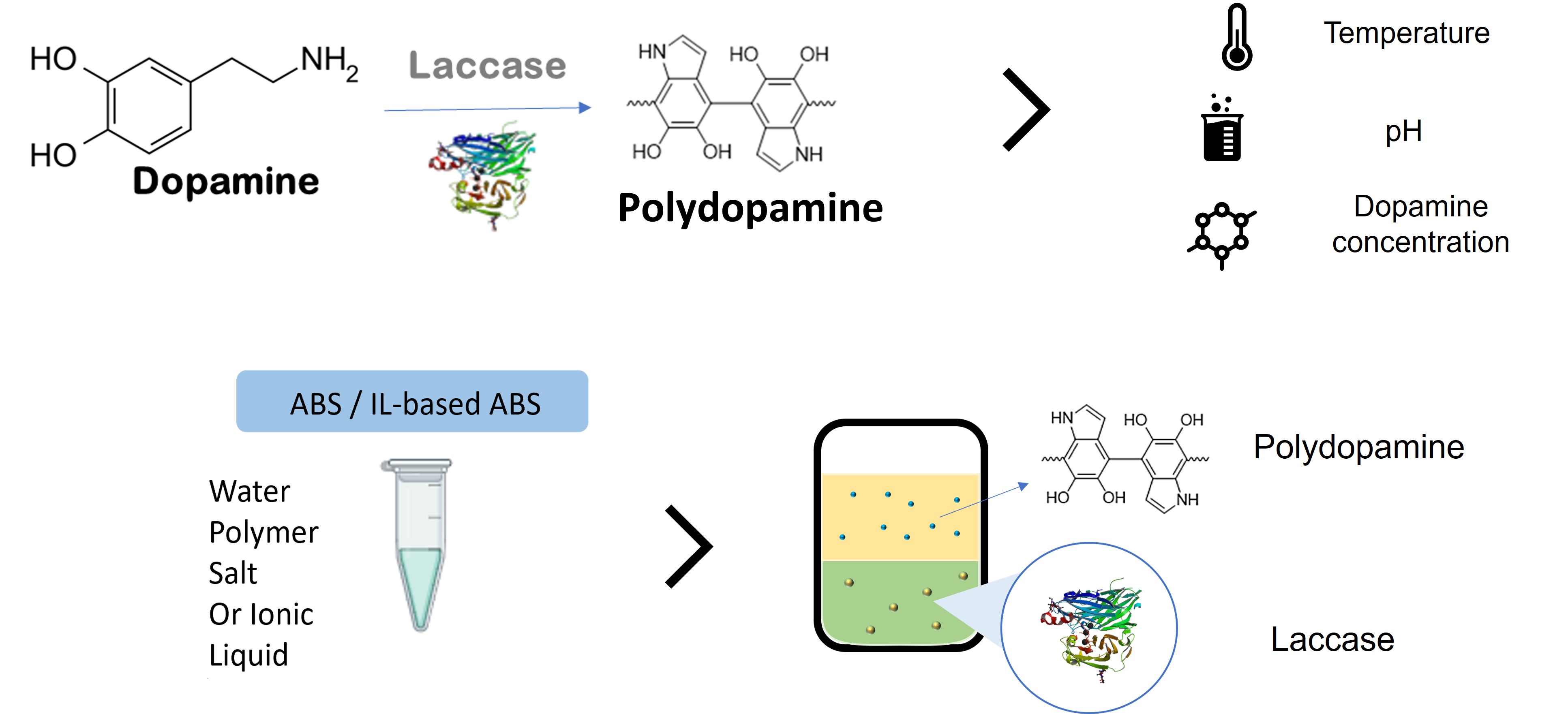 Biocatalysis contributes to a more eco-friendly and sustainable industrial chemistry. Therefore, its wide use in industrial and biotechnological processes has increasingly become more evident. One promising application is the enzymatic polymerization of various compounds. Laccase, a multicopper oxidase with high catalytic efficiency and low substrate specificity, has attracted worldwide attention due to its ability to degrade both phenolic and non-phenolic compounds and its involvement in the synthesis of polymers. Being accepted as an environmentally friendly biocatalyst, laccase is widely employed in most sectors of biotechnology.Polydopamine (PDA), an added-value biopolymer that results from dopamine polymerization, has been used for many applications, being highlighted in the modification and functionalization of surfaces and the field of biomedicine. In contrast to the conventional method of dopamine polymerization, which is a time-consuming process and produces PDA films with poor stability, in the presence of laccase the process becomes faster, very efficient and meets the ideals of green chemistry. However, applying a biocatalyst that could be reused and without the loss of its biological properties is an ever-increasing demand for its industrial applications. Thereby, aqueous biphasic systems (ABS), which are mainly composed of water, appear as a promising alternative in this field since they provide a mild and biocompatible environment for proteins.In this study, it was carried out the polymerization of dopamine by using laccase as the biocatalyst. Several parameters including the ideal temperature, medium pH and different initial dopamine concentrations on the polymerization rate have been investigated and optimized.