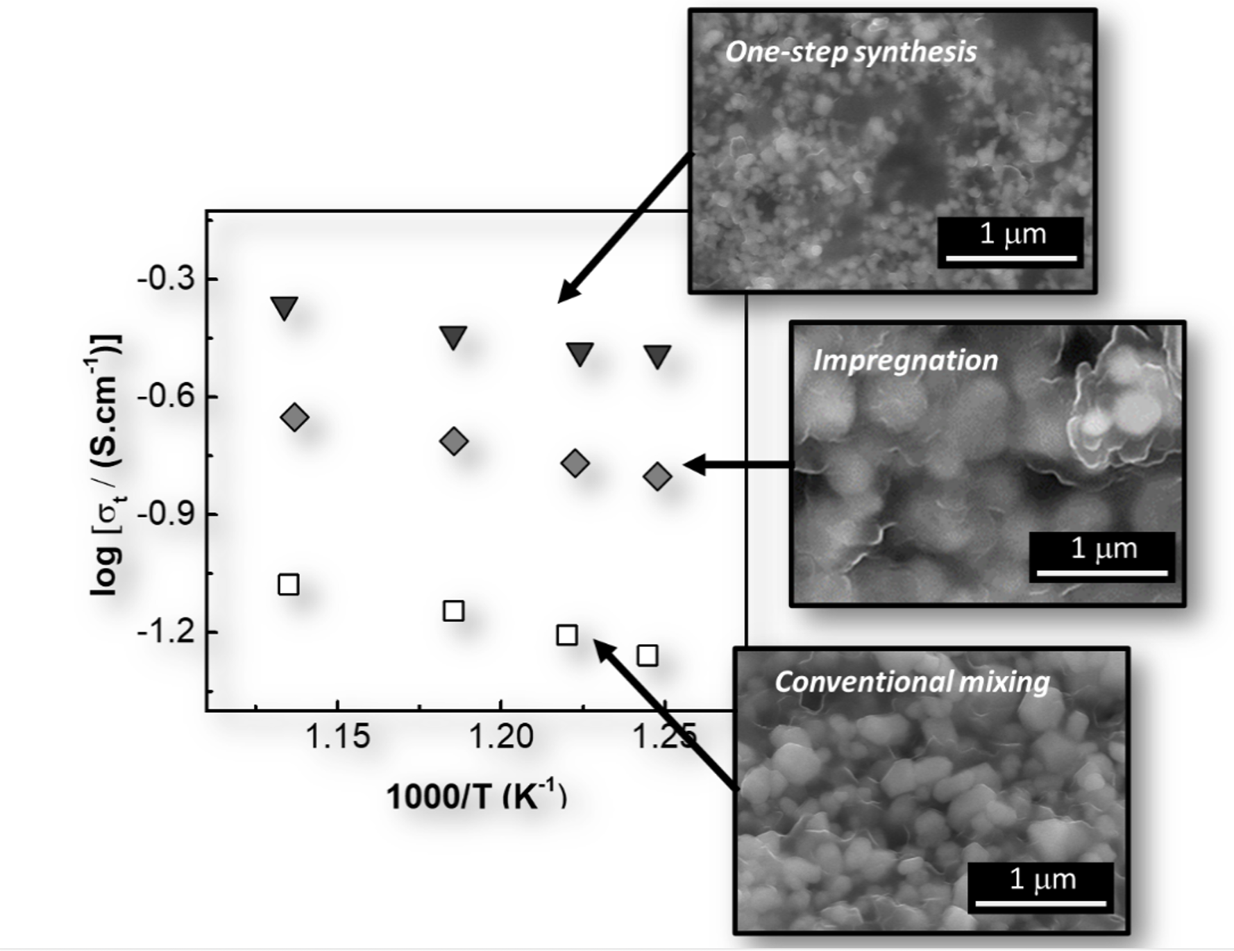 Several composites including Gd-doped ceria (GDC) and a eutectic mixture of lithium and sodium carbonates (NLC) were prepared and tested. Distinct preparation routes (chemical and ceramic, single firing or double firing with infiltration of a porous matrix) were exploited. LiAlO2 – based composites, a ceramic often used as a matrix of Molten Carbonate Fuel Cells, was also prepared as a reference. The structural, microstructural and electrical properties (by impedance spectroscopy in air) of these materials were assessed. A limited set of compositions was also used in measurements of total electrical conductivity in the 600-750 ° C range, at different oxygen partial pressures, including air (pO2 = 0.21 atm) and hydrogen diluted in nitrogen (pO2 <10-25 atm) as extreme conditions. The results obtained confirmed the possibility of modifying/optimizing the percolation of the ceramic phase via the processing route. In the range of operating temperatures of Intermediate Temperature Fuel Cells, GDC/NLC composites prepared by infiltration by molten carbonates combine a robust ceramic matrix with a high total ionic conductivity strongly influenced by the contribution of the molten salt at 600° C. In these materials, the ceramic phase is decisive in the appearance of a significant component of electronic conductivity in reducing conditions, as found for pure GDC.