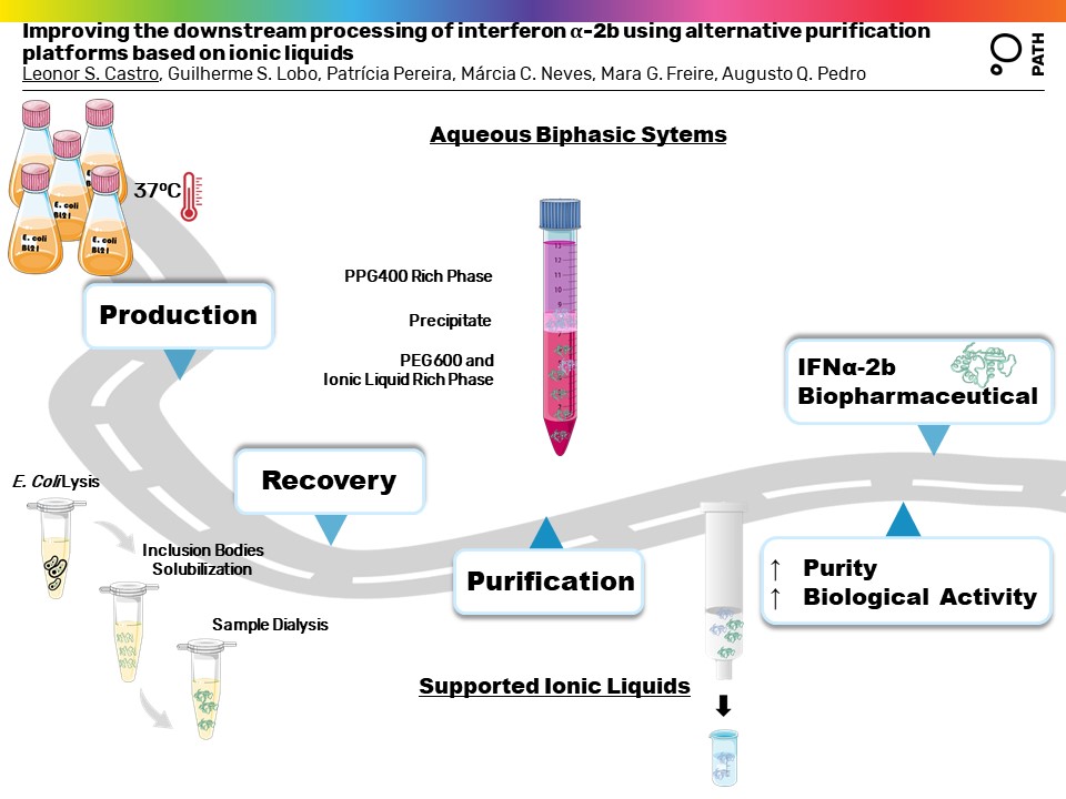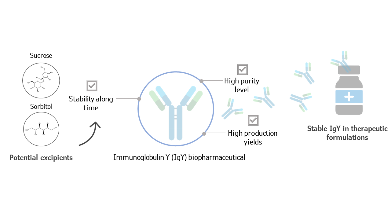 Twitter PosterAvian immunoglobulin Y (IgY), present in the chicken egg yolk, has potential to be used as a biopharmaceutical. Compared to its mammalian analogous immunoglobulin G (IgG), IgY presents advantages, namely high binding avidity and immunogenicity, and their recovery by a non-invasive method at high yields. The amount of IgY obtained from an egg is equal to that from 200-300 mL of mammalians blood, being possible for a chicken produce 17-35 g of total IgY. By being a polyclonal antibody, IgY recognize more epitopes on an antigen. Therefore, IgY has various applications, such as the treatment of several diseases. However, IgY derives from a complex media, making difficult their recovery at high purity and yields. Also, IgY is highly labile to changes in temperature, ionic strength, and pH, being difficult to preserve along time. These two drawbacks restrict their use as biopharmaceuticals. In this work, IgY antibodies were isolated from the yolk of commercial chicken eggs and purified by two precipitation steps. Their stability was assessed by Circular Dichroism Spectroscopy (CD) under 1-3 weeks of storage at -20 ºC, with and without sucrose and sorbitol, to evaluate their use as stabilizers agents. The purity level, concentration and percentage of formed aggregates were determined by Size Exclusion- High Performance Liquid Chromatography (SEC-HPLC), and the protein profile revealed by dodecyl sulphate polyacrylamide gel electrophoresis (SDS-PAGE). Novel bio-based compounds have been identified as promising stabilizers to improve the stability of IgY antibodies, paving the way for their use as excipients in IgY therapeutic formulations.