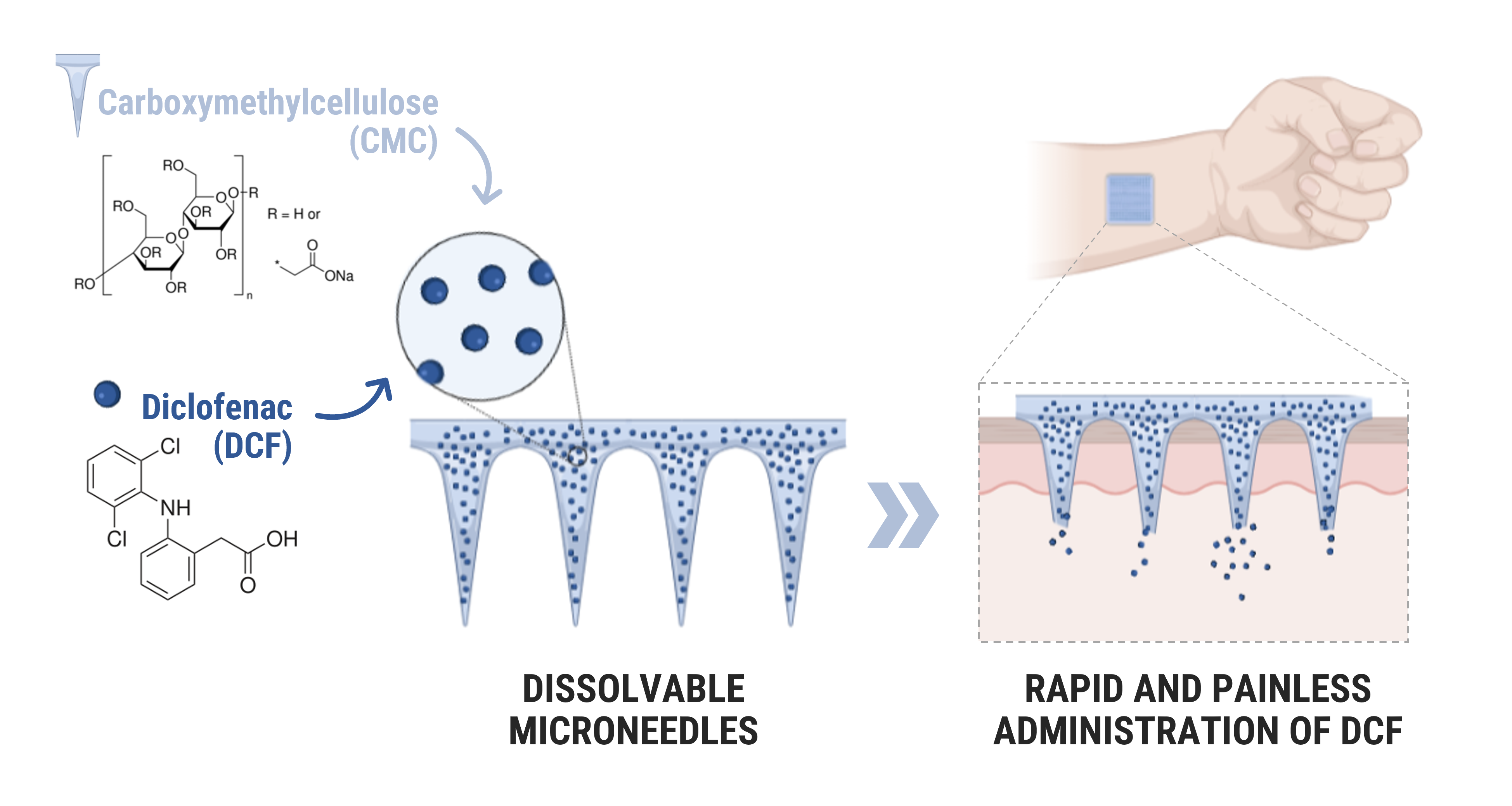 Microneedles (MNs) are minimally-invasive systems comprised of an array of micron scale needles designed to penetrate the skin barrier (i.e. stratum corneum) in a painless mode [1]. Amongst the catalogue of MNs systems, microneedles produced with water-soluble, safe and biocompatible biopolymers are stepping forth in the field of drug delivery, as they are able to promptly dissolve after insertion and release the therapeutic agents across the epidermal layer. In the present work, we report the fabrication of soluble carboxymethylcellulose (CMC) microneedles for the administration of an analgesic non-steroidal anti-inflammatory drug (NSAID), viz. diclofenac (DCF), envisioning rapid pain relief. The biopolymeric MNs were prepared by a simple and eco-friendly micromoulding methodology. The master mould was successfully replicated, achieving complete arrays of pyramidal-shaped needles with ca. 428 µm in height and sharp tips. The MNs revealed good thermal stability (up to 200 °C) and mechanical properties (> 0.15 N/needle). Preliminary in vitro skin studies confirmed the ability of the MNs to pierce the stratum corneum, showing great promise for the permeation of DCF across the skin. [1] Fonseca DFS, Vilela C, Silvestre AJD, Freire CSR. A compendium of current developments on polysaccharide and protein-based microneedles. Int J Biol Macromol 2019; 136: 704–728. DOI: 10.1016/J.IJBIOMAC.2019.04.163.