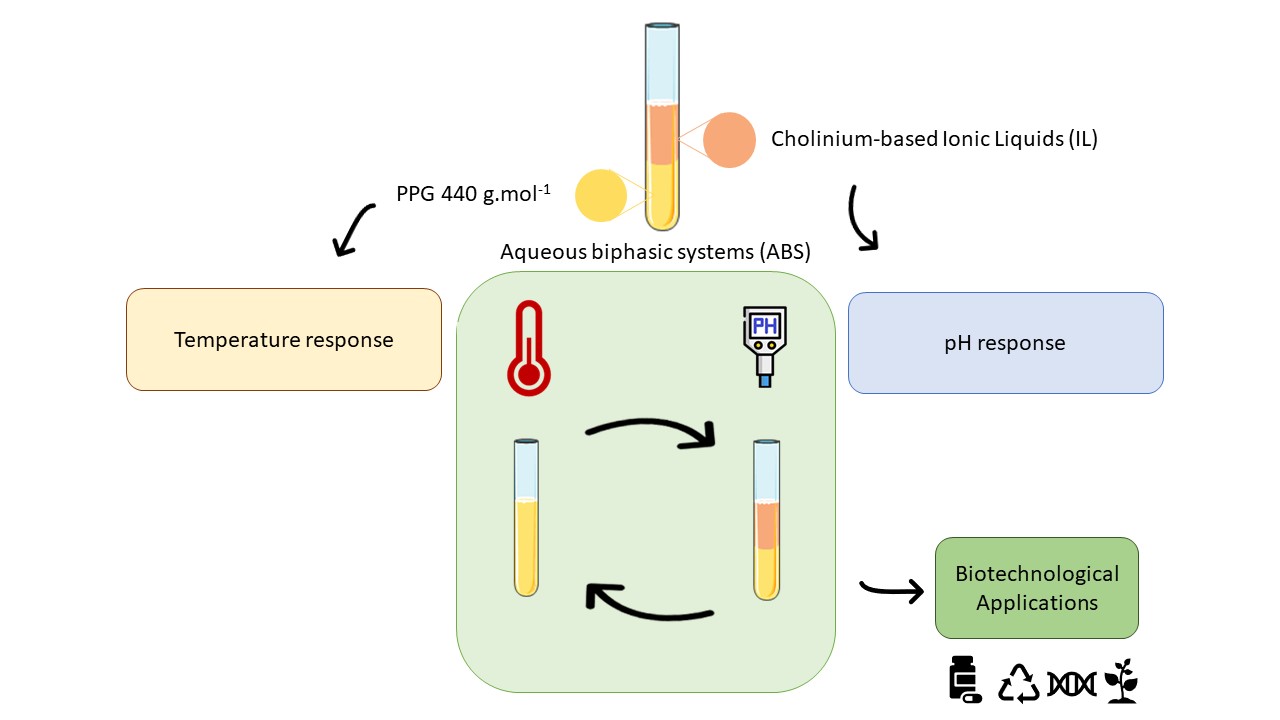 Aqueous biphasic systems (ABS) are an alternative liquid-liquid extraction technique over the conventional ones that employ volatile organic solvents. ABS are mainly composed of water and a combination of two non-volatile compounds, usually two polymers, a polymer and a salt or two salts. Within these phase-forming compounds, ionic liquids (ILs) have several advantages, namely the ability to tailor the ABS extraction performance and selectivity. In this work, the goal is to develop IL-based ABS simultaneously responsive to pH and temperature to design integrated production-separation platforms. ABS formed by ILs and polypropylene glycol with a molecular weight of 400 g.mol-1 (PPG 400) were investigated. Cholinium-based ILs comprising anions derived from carboxylic acids have been studied to allow the anion speciation and have a response to pH, while the response of temperature was achieved with PPG 400. The respective ternary liquid-liquid phase diagrams were determined at three temperatures (25°, 35° and 45° C) and in a pH range from 3 to 7. Based on the attained results, it is demonstrated that the developed ABS are responsive to both pH and temperature, being thus double-reversible liquid-liquid systems. This ABS double-reversible behavior by the application of two stimuli allows the development of customized and integrated production-separation processes in numerous applications.