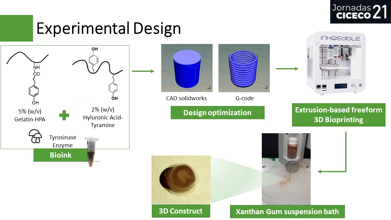 Twitter PosterRecently, 3D-bioprinting technique emerged as valuable tool to produce high-content 3D in vitro models assuming complex 3D structures. In this technique, cells are commonly embedded in relevant hydrogels to form a bioink and then printed according to the desired and pre-established arrangement following a computer assisted design software.In order to improve the printability of hydrogel-based bioinks, researchers commonly modulate their rheological properties and crosslinking densities aiming to obtain more robust inks, which could considering the unique compromise between cell viability, proliferation and differentiation. To face this issue, an emerging strategy is the use of supporting baths to assist extrusion-based 3D-printing processes, assuring the shape fidelity maintenance of the printed constructs and the desired spatial control.In this work, we exploit freeform 3D-bioprinting techniques to obtain highly complex, and cell laden, hollow tubular constructs crosslinked via a fully enzymatic approach. Complex freeform tubular models were obtained by direct 3D-bioprinting of an ECM-mimetic ink comprising hydroxyphenyl propionic acid-modified gelatin (Gelatin-HPA) and Hyaluronan-tyrosine at different concentrations, in a xanthan gum supporting bath containing the crosslinking tyrosinase enzyme. This work paves the way toward fabricating 3D-bioprinted constructs that are independent from synthetic photo-crosslinkers, constituting a more sustainable, yet effective approach to generate such complext structures laden with living cells.