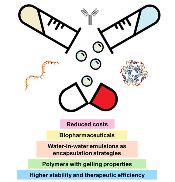 In the past two decades, the pharmaceutical industry has faced significant challenges to accomplish the requirements of an aging society, including in their research activities biopharmaceuticals and by acquiring biotechnology start-ups. Biopharmaceuticals are biological products, which have the potential to treat a wide range of diseases. Their largest fraction corresponds to proteins, and as such easily lose their stability during storage, transportation and administration. Accordingly, protein stabilization through the development of novel and efficient stabilizers and/or novel encapsulation methods is mandatory.Aqueous biphasic systems (ABS) containing phase-forming components with gelling abilities are presented here to prevent the denaturation of therapeutic proteins. After ensuring protein stability in conventional ABS, gellable ABS produced by cost-efficient biopolymers were studied. A drop-wise method for the encapsulation of a model protein in a gelatin-based ABS has been developed, after which an emulsification module was used to optimize particle size and homogeneity, and encapsulation efficiency.