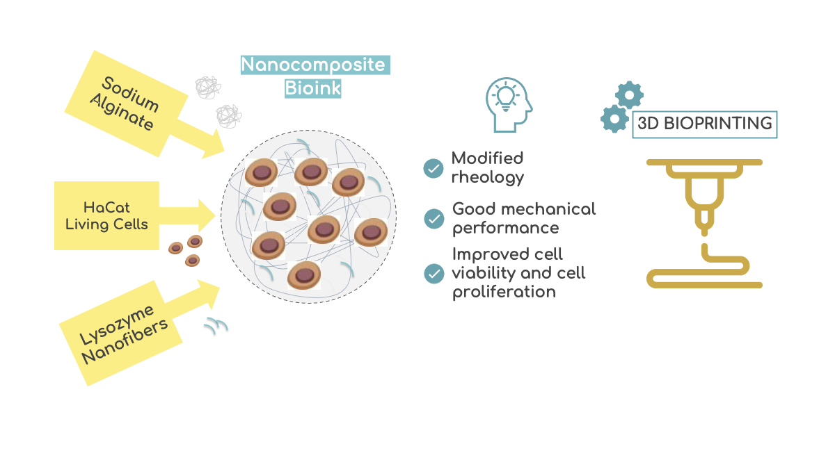 Within the field of 3D bioprinting, the development of high performance bioinks with adequate mechanical and rheological properties and high cell viability, is still a major challenge. Engineered hydrogel bioinks based on natural polymers, such as polysaccharides are currently being widely explored. Polysaccharide-based hydrogels, such as alginate hydrogels present low cytotoxicity and high hydrophilicity. However, alginate hydrogels have some limitations, such as poor shape fidelity and cell-adhesion, that are usually overcome via blending with other materials and cell-adherent molecules. Considering this approach, protein nanofibers have excellent properties in terms of mechanical strength and stability, and also antimicrobial and cell-adherent activities, and can be used as building nanoblocks on the design of innovative functional nanomaterials. This work was focused on the development of novel nanocomposite bioinks based on alginate hydrogels reinforced with lysozyme nanofibers. The obtained hydrogels showed improved mechanical performance, good printability and non-cytotoxicity towards Hacat cells (human keratinocytes).