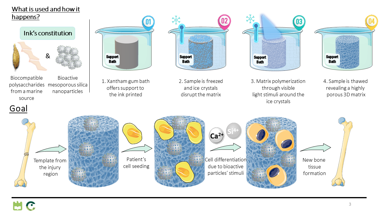 Bone damage is a very common occurrence, where about 10% of the cases require some type of graft. Alternatively, strategies have been proposed by combining biomaterials and cells as hybrid devices for tissue engineering. Here we introduce 3D printable cryogels that are bioactive, biocompatible and have excellent mechanical properties. In this work, an ink for 3D printing cryogels was designed based on methacrylated laminarin and methacrylated mesoporous silica nanoparticles. Due to laminarins’ low viscosity, a xanthan gum support bath and alginate solutions were used to conferee all the necessary prerequisites for printing. Our method virtually allows the printability of any desired polymer since the main constituent (laminarin) has no viscosity, which is one of the most important aspects for printing. The design of cryogels, which alternative can be described as sponges, goes by conducting the crosslink below water freezing point in order to obtain a highly porous structure. 3D porous structures are desired in biomaterials due to the increment of nutrient diffusion, cell perfusion and spreading through the gel. In our system, the bioactive silica nanoparticles are known to be able to release calcium and silicon ions that can promote the differentiation of stem cells into osteoblasts and thus stimulating the formation of new bone tissue. Our material allows the personalization of the therapy applied since the structure can be designed in function of the injury. Moreover, the system is built under the use of sustainable materials (polysaccharides of marine origins) and over green principles (nanoparticles synthesis – Stober method).