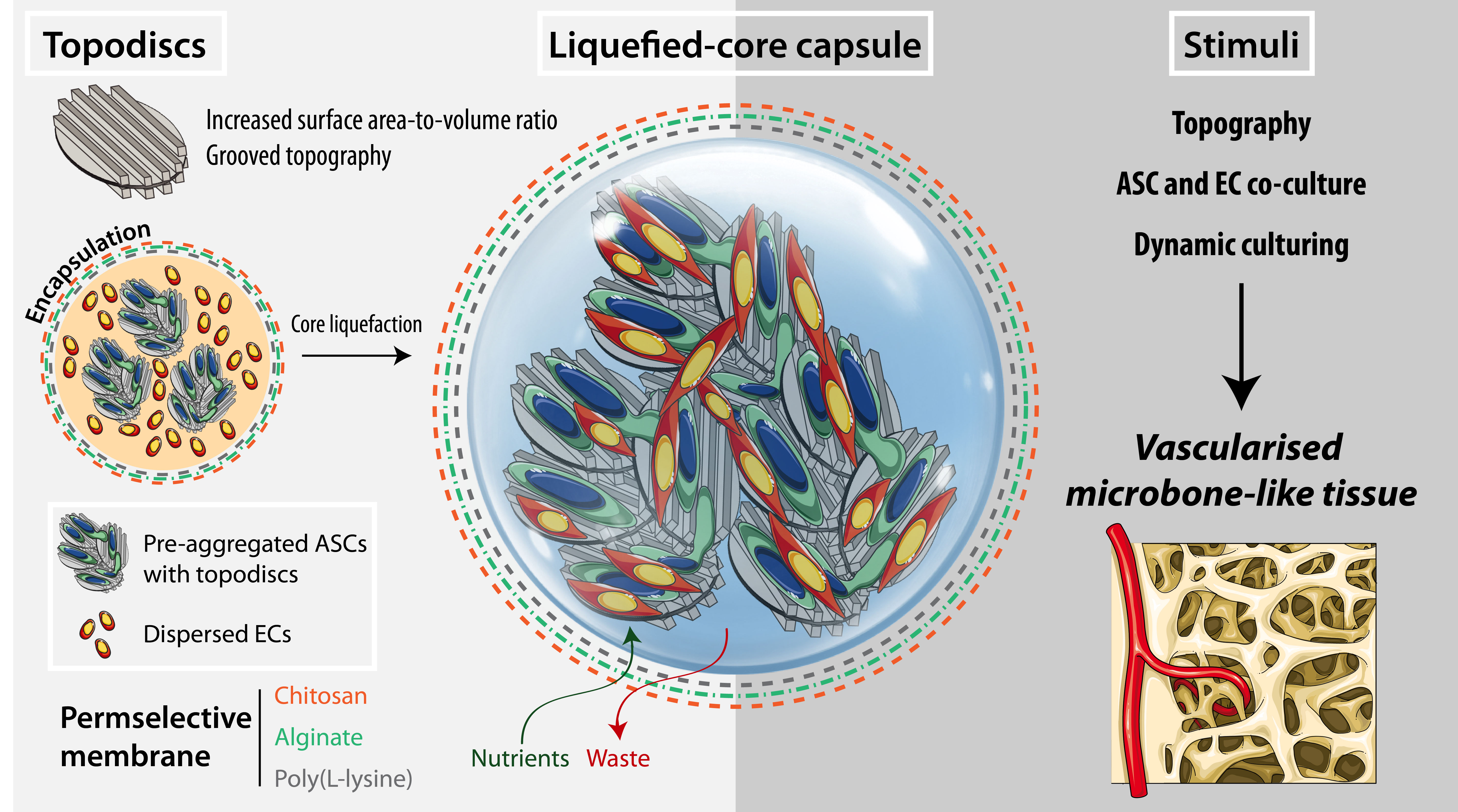 Cell behaviour and stromal cell differentiation into distinct lineages have been shown to be actively influenced by surface topography. Whereas this has been verified in a 2D context, the role of topography in 3D, which better mimics the natural cell environment, needs to be explored. To this end, we developed nanogrooved microdiscs (topodiscs) as substrates for a bottom-up cell-mediated 3D-construct fabrication and combined them with the technology to produce compartmentalised liquefied-core capsules. The liquid core is established upon mild liquefaction, enabling previously formed 3D aggregates of topodiscs and ASCs to serve as living support for freely dispersed HUVECs, via sequential seeding. While topodiscs are expected to provide topographical cues to direct osteogenic differentiation of previously adhered ASCs, the resultant 3D aggregates will provide living domains for junctional intercellular communication with HUVECs. Our hypothesis is that by combining topographical cues with cell signalling pathways, bone-like microtissues can be developed by a truly tissue engineering strategy and without requiring cell culture supplements. Mineralised microaggregates composed of ASCs and topodiscs were effectively achieved within compartmentalised liquefied-core capsules. The nanogrooved surface of topodiscs proved to be an impacting factor to induce osteogenic differentiation of ASCs. ASC-topodisc aggregates were demonstrated to be optimal supports for HUVEC adhesion. Next, neo-vascularisation of the established co-culture will be studied, as well as the effects it may have on the quality of the bone-like microtissue formed. We envision to propose the developed technology as a patient-specific bone TE strategy for minimally invasive procedures.