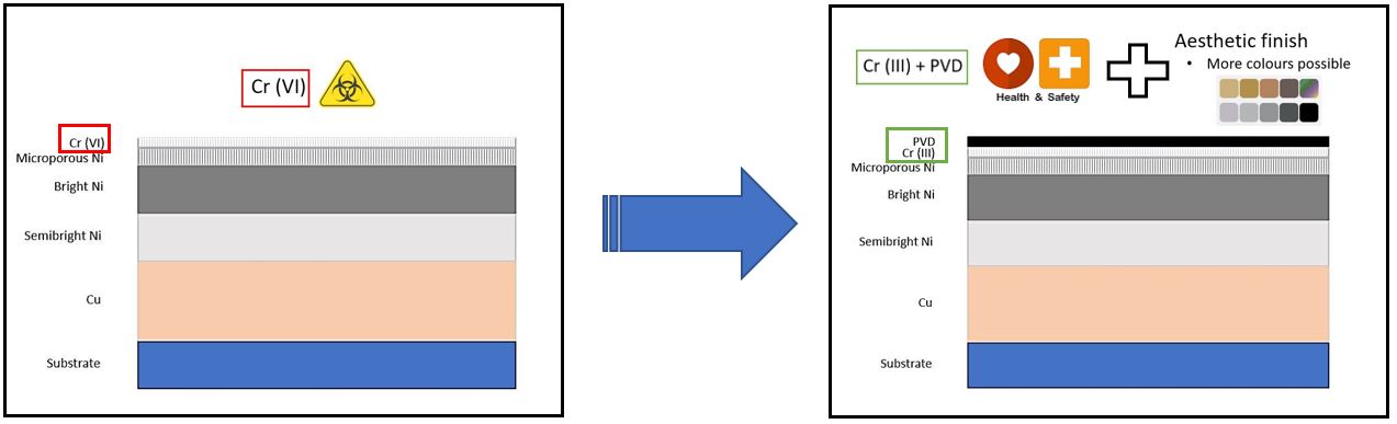 Twitter PosterSafeChrome project aims to investigate a hybrid solution to replace the hexavalent chromium-based multilayer decorative coatings applied on polymeric and metallic components. This hybrid solution consists of a PVD coating deposited on a trivalent chromium layer that must have an aesthetical finish, and mechanical and corrosion resistances identical or improved compared to the hexavalent chromium-based decorative coatings. The PVD coating applied on the trivalent chromium layer will have the advantage of allowing a wider colour choice that can promote the development of new products for the automotive and optoelectronic industries. The PVD coating adhesion and thickness uniformity throughout the parts surface will be a challenge, particularly for parts with complex geometry. Additionally, the temperature of the polymeric substrates cannot exceed their glass transition during the PVD coating deposition, which require new solutions. The deposition of a PVD coating on a trivalent chromium layer can change the corrosion mechanism active during exposition to the environment. The PVD coating material, thickness and microstructure can have a great effect on the overall mechanical and corrosion resistance of the hybrid coating. Therefore, different PVD deposition techniques and materials will be tested, and the resulting coatings will be evaluated on aesthetic finishing, corrosion and mechanical resistance.