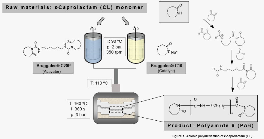 The current demands of the automotive market and the global policies concerning sustainability, recyclability, and energy efficiency, have attracted researchers to use innovative materials in order to reduce the weight of novel cars. Due to its low density and rigidity, thermoplastic matrix composites have emerged in the automotive industry as an alternative strategy with huge potential, capable of keeping the mechanical properties of thermoset matrix composites.Polyamide 6 (PA6), also known as nylon 6, is a widely used thermoplastic in automotive industry. Since, this material is used in the production of structural components for autoparts, its mechanical properties have an important role. In situ polymerization through thermoplastic resin transfer moulding (T-RTM) allows the polymerization of liquid polymeric precursors with low viscosity in the presence of suitable catalysers and activators. T-RTM is a technology that can be employed to produce tougher, lighter, and recyclable composites for use in automotive applications.The reactive anionic polymerization of ↋-caprolactam (CL) is one of the most developed forms of reactive processing of thermoplastics. This study analyses the influence of different catalyst and activator dosage levels in the polymerization of PA6. The results demonstrate the influence of catalyst and activator content in the final properties and highlight the importance of optimizing the dosage levels in order to maximize the physicochemical properties of PA6.