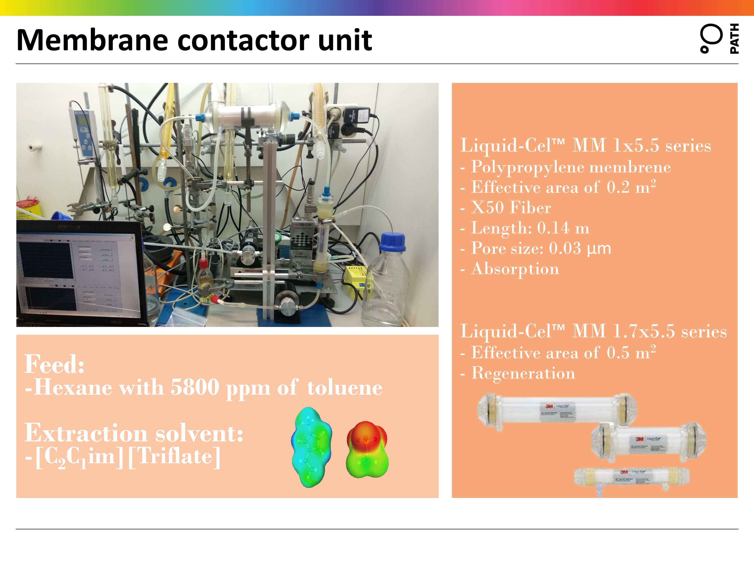Twitter PosterAliphatic solvents such as hexane and heptane are obtained mainly through the fractional distillation of petroleum. This solvents in turn are used in food, pharmaceutical and polymer industries. With increasing demands and restrictions for higher purity from these markets, it stands crucial for refining companies to invest in processes for the reduction of aromatic and olefinic impurities in their aliphatics to keep themselves competitive. With this in mind, trials were conducted with a membrane contactor unit using the 1-ethyl-3-methyl-imidazolium triflate [C2C1][OTf] IL as extraction solvent in order to optimize the separation conditions for the aromatics and assess the regeneration of the IL as this will greatly increase the economic feasibility of the unit.