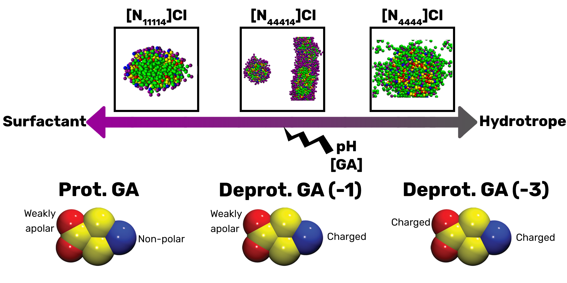 Water, the king of solventsThe king is very available to his people, he does not create toxic environments, is cheap on your expenses, is not flammable with kingdom problems, and is suitable for the environment. However, the king does not like so much the presence of the hydrophobic neighbours is his kingdom. So, how to help water? In this scene, appears the friends called Hydrotropes! Hydrotropes have an amphiphilic structure that can increase the solubility of hydrophobic solutes in water. In other words, hydrotropes can change the mood of our king, and he can live in harmony with the hydrophobic neighbors, also doing some interactions with them.But, how are these interactions? Is it magic? Maybe a witch has helped the king... Over the years, some theories were proposed to explain these interactions, such as the self-aggregation of hydrotropes, the disruption of water structure, and the stoichiometric argument. Recently, the cooperativity model was proposed by Shimizu and Matubayasi. [1] Our group also proposed a molecular mechanism that we affectionately call the “apolarity factor”. We are also trying to describe how the surface volume of the hydrotrope can mediate these interactions. In a final step, we are interested in how these hydrotropes can act in real applications.Our team and our king have been unraveled many mysteries in the world of hydrotropy. We hope to see you on more adventures like that. The end.