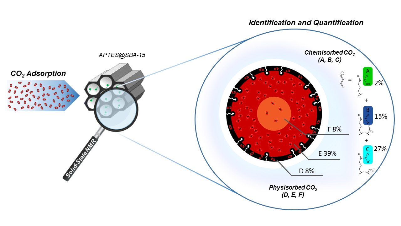 Global warming has triggered the development of CO2 capture technologies from large point emission sources as one of the most efficient ways to mitigate CO2 emissions. Amine-modified mesoporous silicas (AMPS) have attracted major attention as the next generation of CO2 adsorbents as their surfaces can be easily tailored for improved CO2 adsorption.Despite the great promise of AMPS materials, CO2 adsorption mechanisms at their surfaces are not yet well understood. A number of distinct CO2 species may form in silica surfaces that govern many relevant adsorbent properties (e.g., adsorption capacity, selectivity, cyclic stability). Although the nature of these species have been investigated by vibrational and NMR spectroscopies, their assignment are often contentious. In our group, the tandem use of NMR and modelling have been a very successful approach to address CO2 chemisorption mechanisms. However, either the quantification or the molecular dynamics of surface CO2 species are yet to be studied.In this presentation we demonstrate how relaxation and CSA NMR measurements can be used to characterize the dynamics of confined chemisorbed and physisorbed CO2 species. This approach has allowed the identification and quantification of up to six CO2 species.