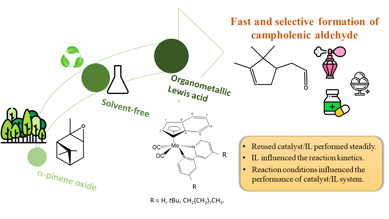 Campholenic aldehyde (CPA) is an important intermediate in the synthesis of sandalwood fragrances, e.g. Sandalores and Javanols (Givaudan), Bacdanols (IFF), Brahmanols (Dragoso) and Polysantols (Firmenich). CPA may be produced via the acid-catalyzed isomerization of α-pinene oxide (PinOx) in the presence of Lewis acids. The use of ionic liquid (IL)-standing catalysts (ILSC) for CPA synthesis has shown some promise in a limited number of published studies. Combining organometallic Lewis acids such as [IndCpMo(MeCN)2](BF4)2 with ILs has thus led to systems that can give quantitative CPA yield within minutes of reaction under mild conditions (35 °C). Besides catalytic activity and selectivity, the catalyst recovery/reuse is an important aspect for practical application. In previous work, we found that the ILSC system [IndCpMo(MeCN)2](BF4)2/[choline bis(trifluoromethylsulfonyl)imide] led to increasing CPA yield in consecutive batch runs, reaching 98 % in the fifth run. In the present work, indenyl molybdenum dicarbonyl complexes of the type [IndMo(L)(CO)2]BF4 (L = 2,2’-bipyridine (bpy, 1), 4,4'-di-tert-butyl-2,2'-bipyridine (tBubpy, 2) or 4,4′-dinonyl-2,2′-bipyridine (dNbpy, 3)) were prepared and fully characterized. These complexes were tested as catalysts for PinOx isomerization under mild conditions, achieving relatively fast and selective formation of CPA. The influence of the type of ionic liquid and reaction conditions (initial PinOx molar concentration and initial catalyst concentration) on the catalytic reaction were investigated for the best performing catalyst.