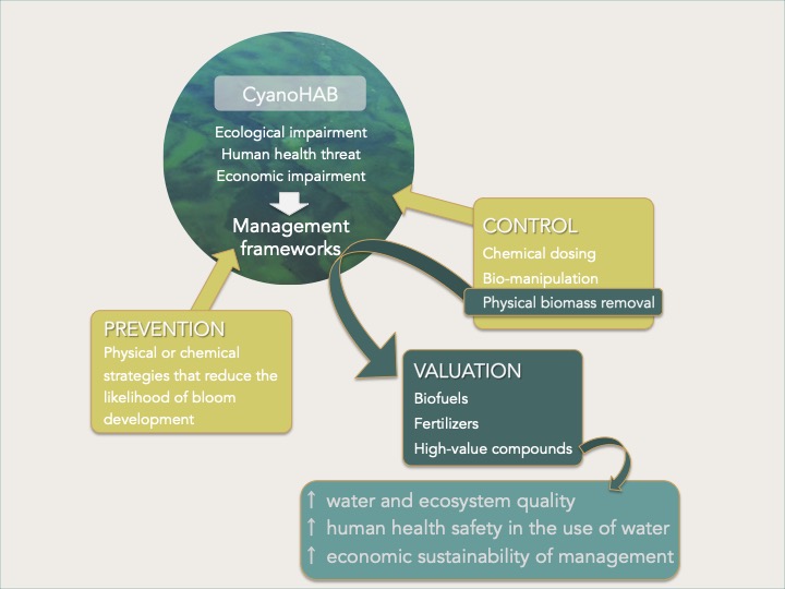 Global warming and the anthropogenic degradation of water quality are pointed out as main causes of the worldwide increase in frequency, severity, and duration of harmful algal blooms (HAB). Cyanobacteria, major constituents of HAB, can cause ecological, economic, and human health problems. Their growth can be potentiated by climate change consequences, highlighting the urgency of improving HAB management strategies to ensure water quality. An innovative perspective for cyanobacteria management is the exploitation of their “bright side”. Several exploitable products produced by cyanobacteria (e.g. bioactive pigments, lipids, proteins) present high market value. Thus, our work provides a critical perspective on how HAB management may be connected with biotechnology in the future. We propose the use of the biomass of cyanobacteria blooms physically removed in traditional control actions as a feedstock for future valorization, thus allying profit to water quality management, in a win-win relationship between economics and sustainability.