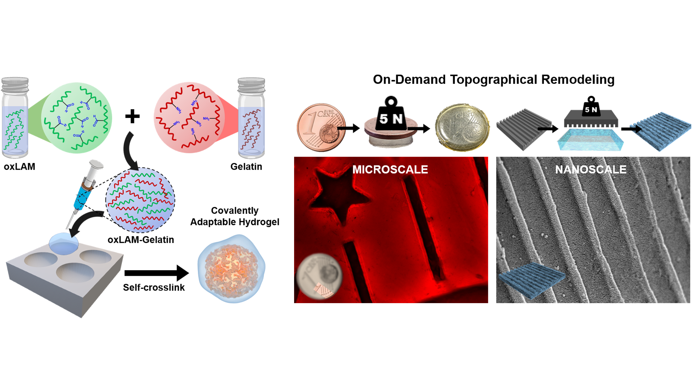 Biological tissues are not static entities but rather operate in constant adaptiveness to their surroundings. Such dynamic behavior stems from its viscoelastic extracellular matrix (ECM) that can adapt its intricate network to dynamic mechanical stimuli. This ability to convert incoming mechanical inputs into biophysical cues is vastly underexplored in hydrogels, which are typically static networks owing to their covalent crosslinks. Herein, we developed force-responsive hydrogels based on a hybrid combination of polysaccharide/polypeptide biomaterials (i.e. gelatin and aldehyde-laminarin) that can self-assemble through dynamic covalent chemistry, taking inspiration from the native Schiff base crosslinking present in ECM maturation. Such mechanochemical hydrogels can transduce mechanical forces into 3D architectural rearrangements, which was leveraged for reconfiguring their surface on-demand with any intended micro- or nanotopographies intrinsically bearing cell-adhesive motifs. Furthermore, human stem cells contacting hydrogels mechanically-sculpted with anisotropic nanopatterns sensed the underlying nanotopography and rapidly aligned parallel to the nanoridge/nanogroove intercalating array. Ultimately, such platforms are promising for bioengineering naturally anisotropic tissues or to be explored as cell-instructive building blocks in advanced tissue engineering strategies.