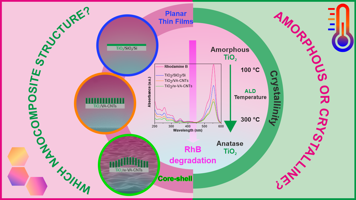 Titanium dioxide (TiO2) is one of the metal oxides that stands out as photocatalyst material mainly due to its high oxidizing power, low relative cost, photostability, non-toxicity and insolubility under most conditions. These characteristics make TiO2 a very attractive material for environmental applications, especially in solar driven degradation of organic pollutants in wastewater treatment. An enormous effort has been to improve the photocatalytic properties of this remarkable material. In this way nanostructured TiO2 combined with the great specific surface support achieved by vertically aligned carbon nanotubes (VA-CNTs) arrays appears to be a suitable solution to promote the enhancement in the photocatalytic activity of TiO2.Herein, we present a controlled deposition of TiO2, via atomic layer deposition (ALD) on high surface area supports, such as wave-like patterned carbon nanotube (w-VA-CNTs) arrays. TiO2/w-VA-CNTs nanocomposites were prepared varying the loading amount of TiO2, by applying different number of ALD cycles onto the surface of the nanotubes, as well as the deposition temperature towards the optimal photocatalytic performance, which can be defined by the TiO2 thickness and crystalline structure. The photocatalytic performance of these nanocomposite materials was tested in the degradation of rhodamine B (RhB), a harmful dye present in food and textile wastewaters. The photodegradation experiments under ultraviolet light on RhB revealed that the nanocomposite comprised of anatase crystalline TiO2 grown at 200 °C (11.2 nm thickness) presented the highest degradation efficiency, around 55% with an illumination time of 240 min.